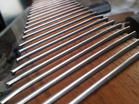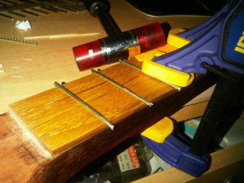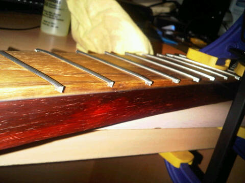 Using my squeeze clamps I made a fret presser. I used Patrick Hufschmid’s technique to prepare the neck and to hammer the frets in. I used epoxy to fill the slots incase I messed up somewhere. Hammering in frets is awesome. Now all I need to do it find some way of trimming the ends…