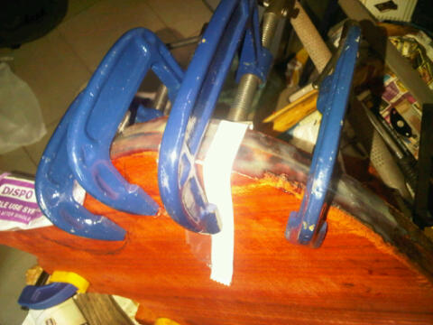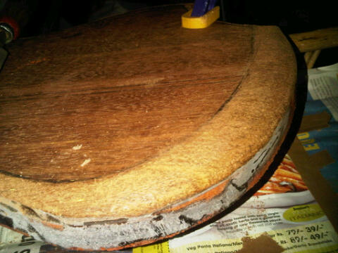 So when I began to further shap the body, I heard a crack and nearly shat myself. The top has completely come undone on one quarter of the body. This was a huge problem. Another problem was getting around to filling the deep gash. This is where living near a hospital comes in handy. I bought a syringe and mixed some epoxy and injected it deep into the crevasse. I used way more than necessary but in a situation like this I had to be damn sure it was completely covered. So the end result was a ton of shit to rasp off but an awesome glue line. We’ll call it Plastic Surgery for Guitar…