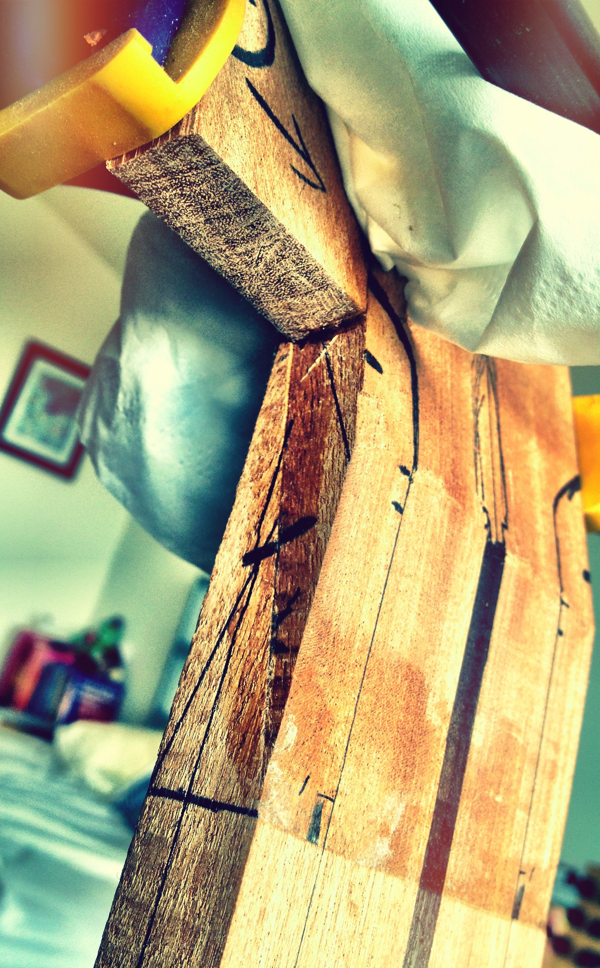 I drew the neck shape and began to glue the ears on. Kinda tricky as the glue is slippery as all hell. Let’s hope this all works out. I’ll know when I get the whole shape cut out- hopefully it won’t come apart. So far for small 15-30 min sessions each day everything’s going alright!