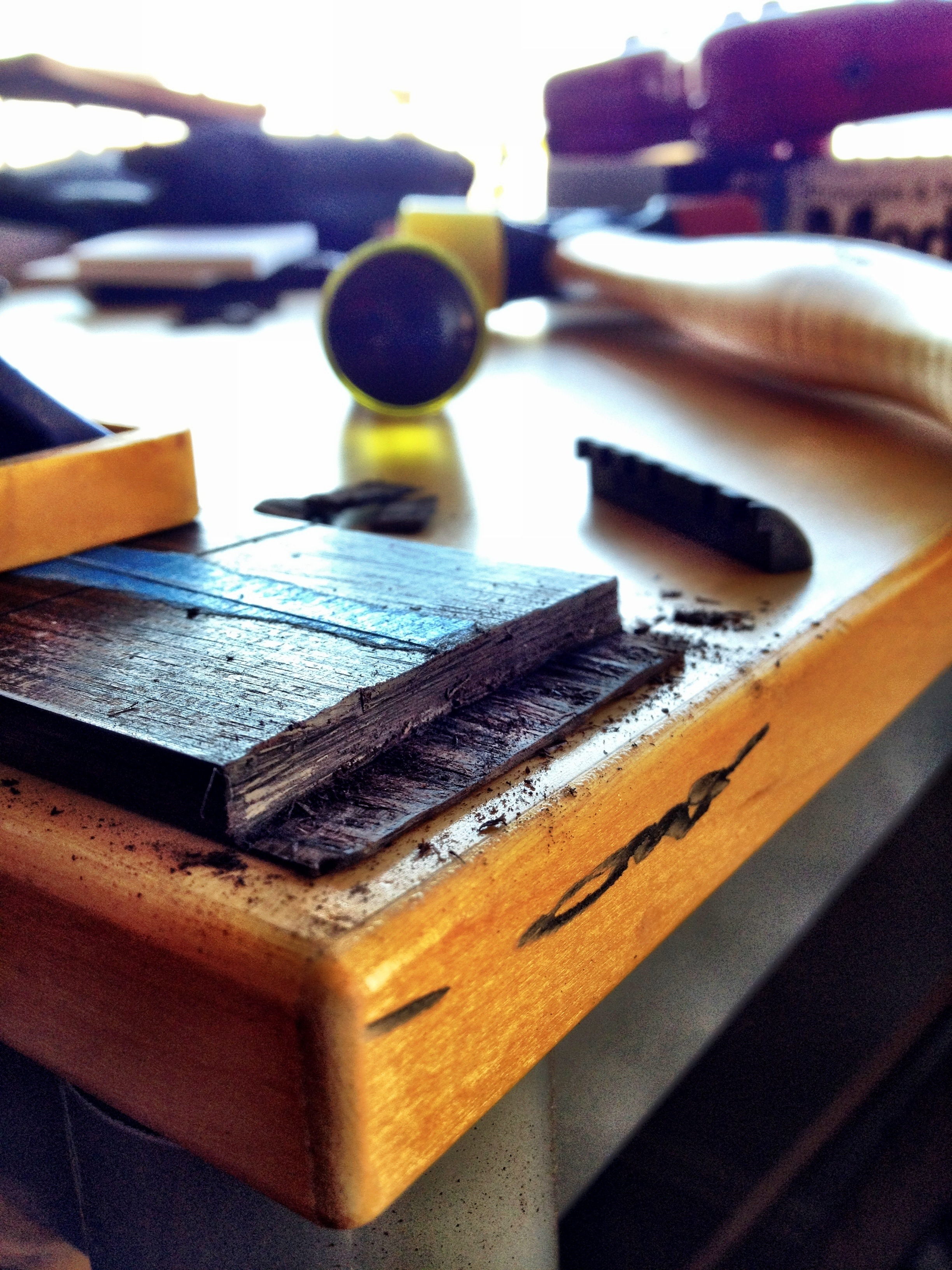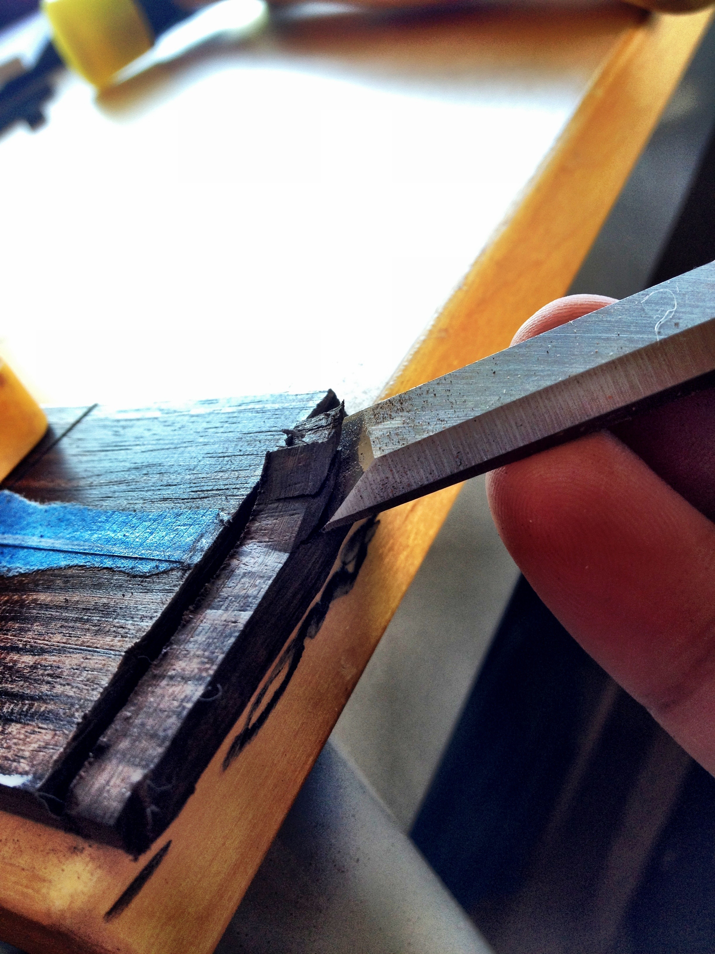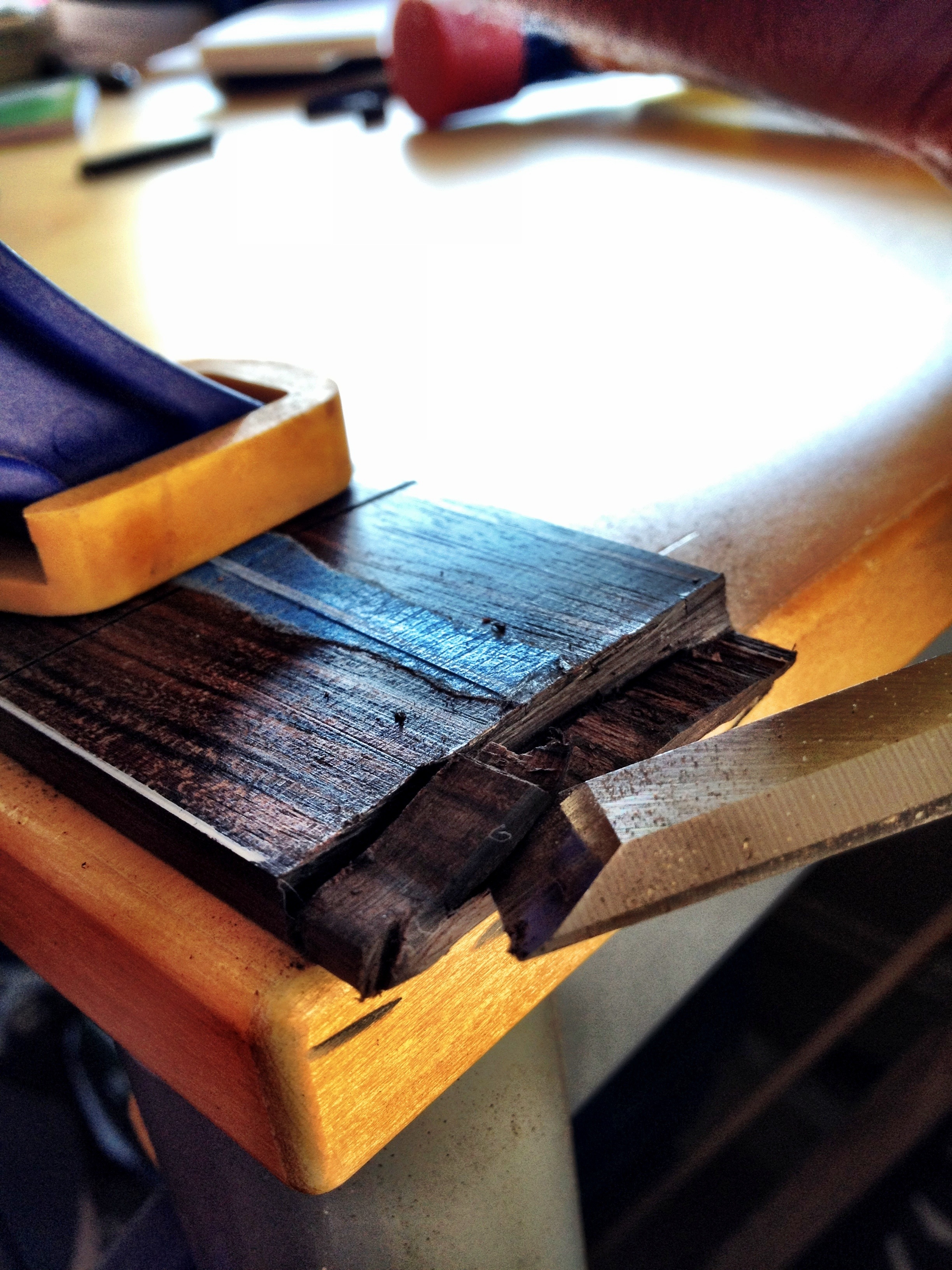 The dremel trio couldn’t hack it. So I brought out the chisels and carefully removed layers of the Macassar ebony. Now the earvana nut will sit well on the fretboard. Also using the tiny sanding drum on the dremel trio, I shaped the headstock to its roughly final dimensions. Hopefully tonight before i fall asleep, I’ll have the fretboard glued and clamped on!