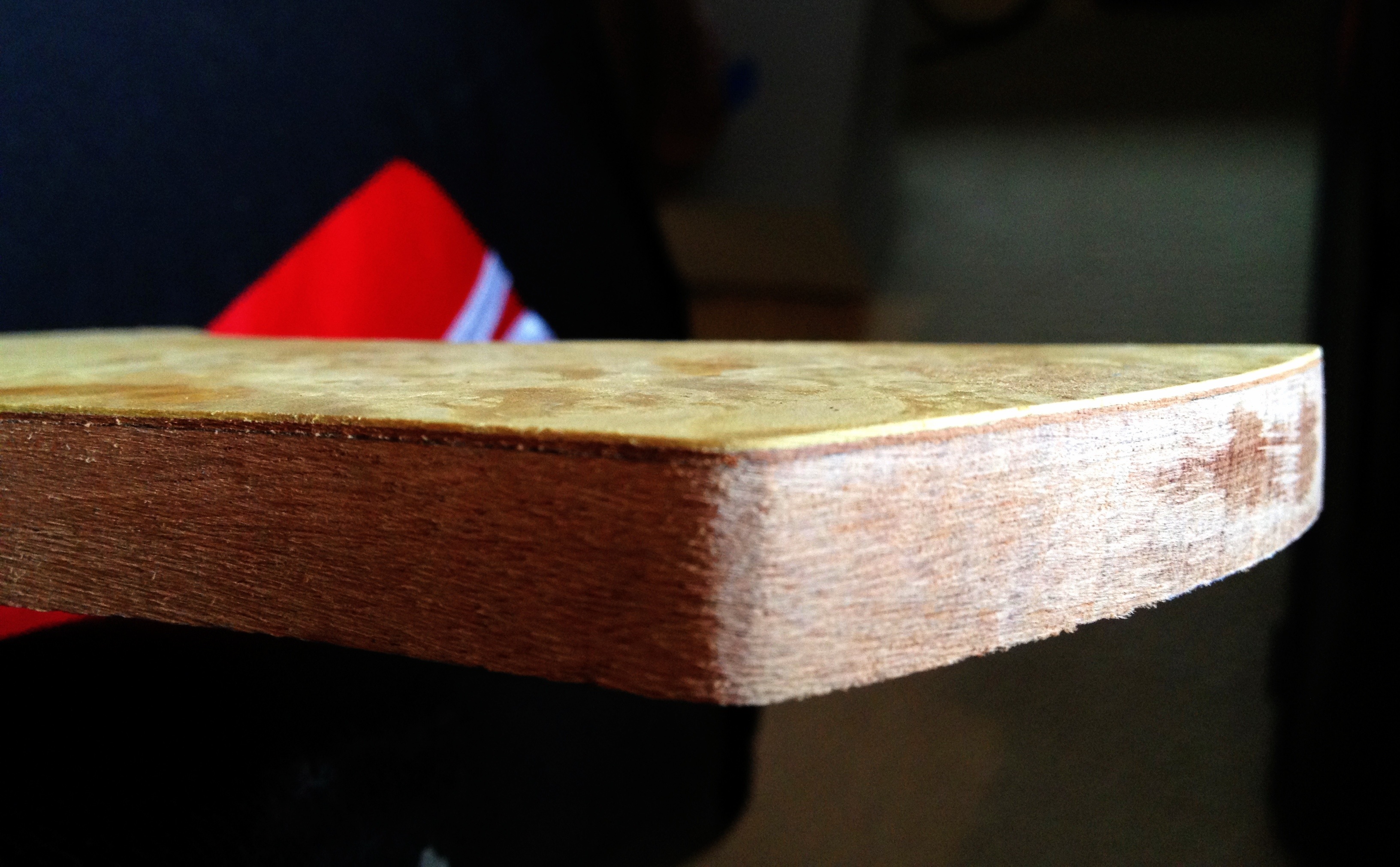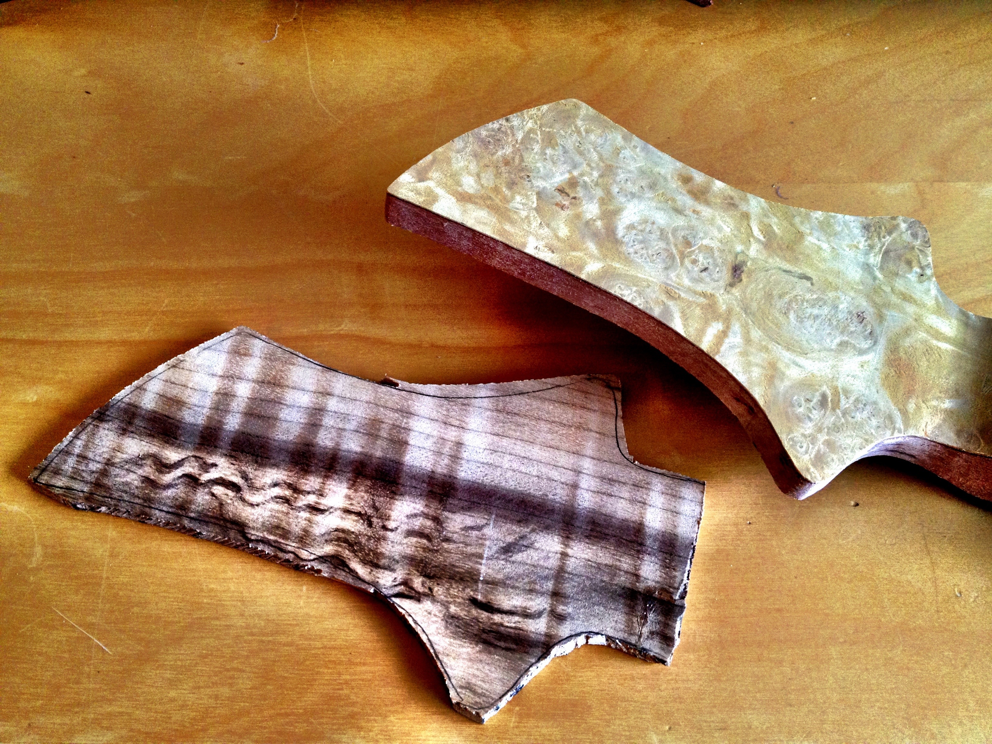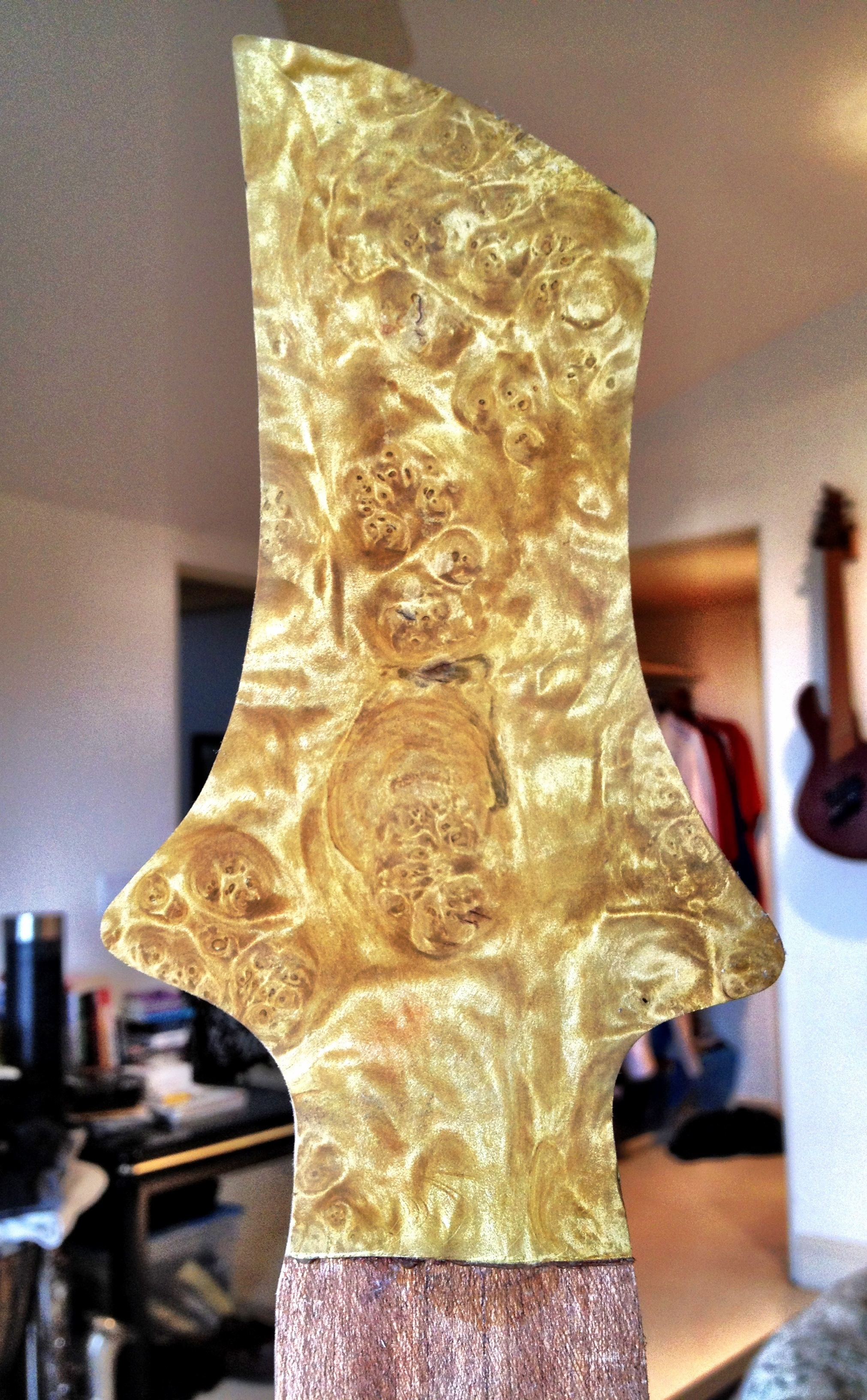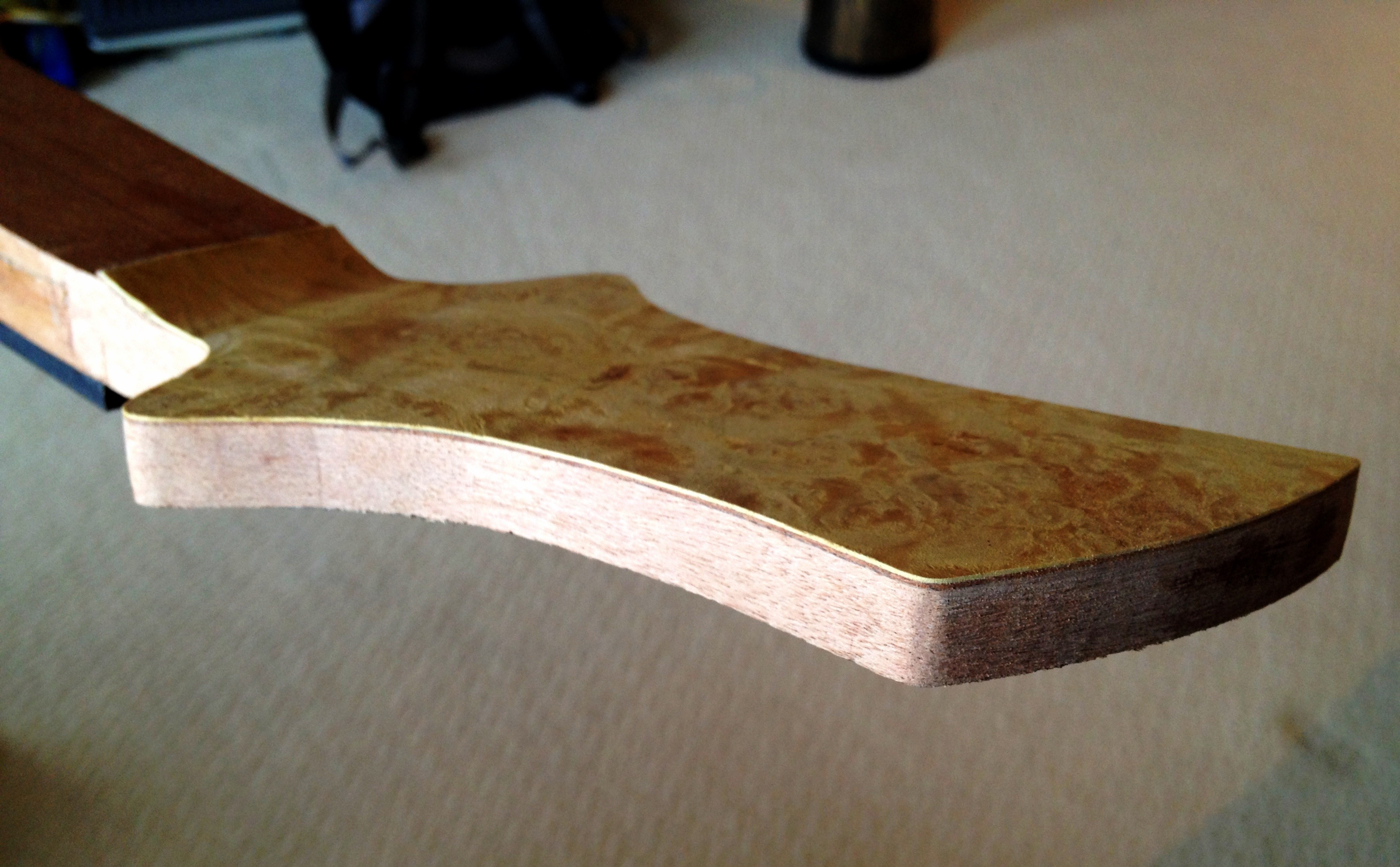 Vik guitars inspires me. I’ve studied that guys build threads and decided I try out the sandwich veneer thing he does on his head stocks. It’s classy and adds a nice accent. It’s easy to apply but hard to manage the amount of glue. Titebond 3 is very low in viscosity and the wood itself basically drinks up the first application. I’ve found, through my fumblings, that allowing the glue to stay on the surface for a few minutes before applying the veneer will allow for a much smoother application. This is mainly because initially the glue isn’t tacky at all. After a few minutes it becomes tacky enough so whatever you place won’t move very far.