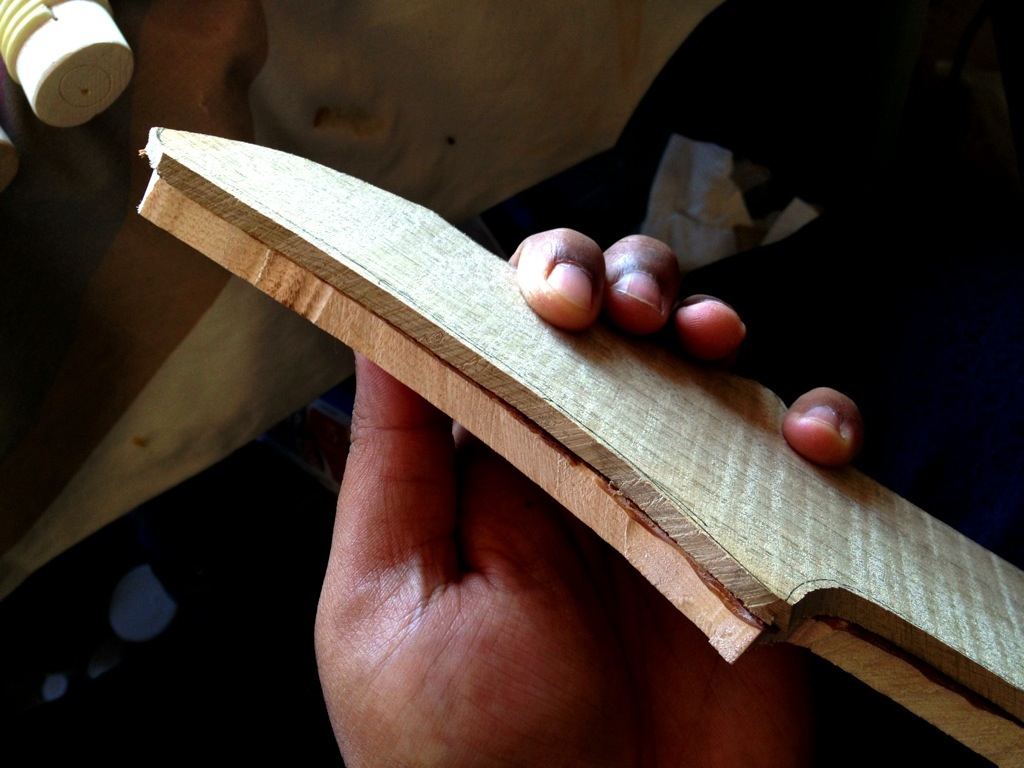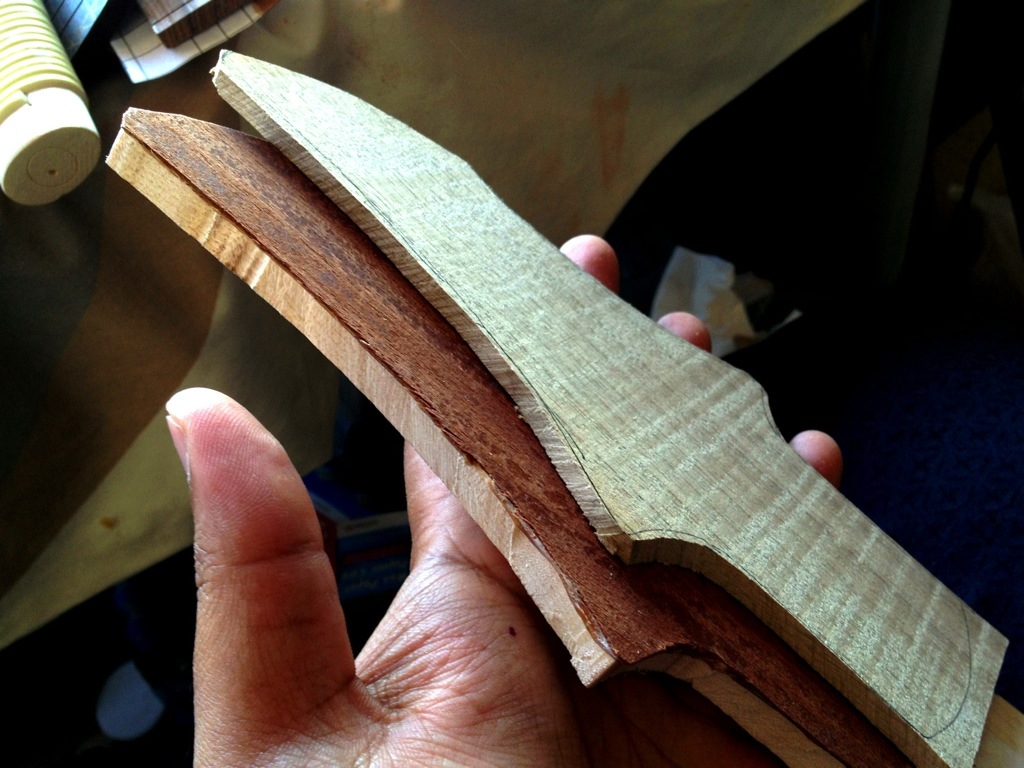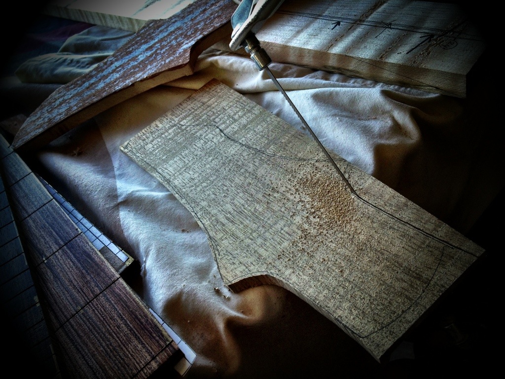 February 27, 2013February 27, 2013 Bahamut’s Headstock I’ve been neglecting this one. So I made quick work of the veneer and Myrtlewood headplate. I’m so happy I can use all this figured wood tops I’ve been hoarding. I was running out of places to store them. Share this: Click to email a link to a friend (Opens in new window) Email Click to print (Opens in new window) Print Click to share on Facebook (Opens in new window) Facebook Click to share on X (Opens in new window) X Like Loading... Related