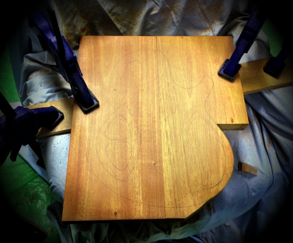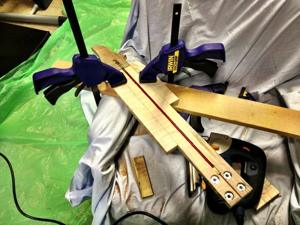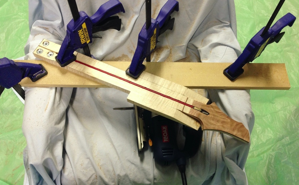 I am getting real good with this cheap ass jigsaw. Lots of progress. In one hour I was able to cut out the other two necks, glue the seven string fretboard, and cut out the body for the bass. . Hopefully tomorrow the six string neck will be glued and the seven string neck fretted. Don’t know if ill have time but things are moving faster now!