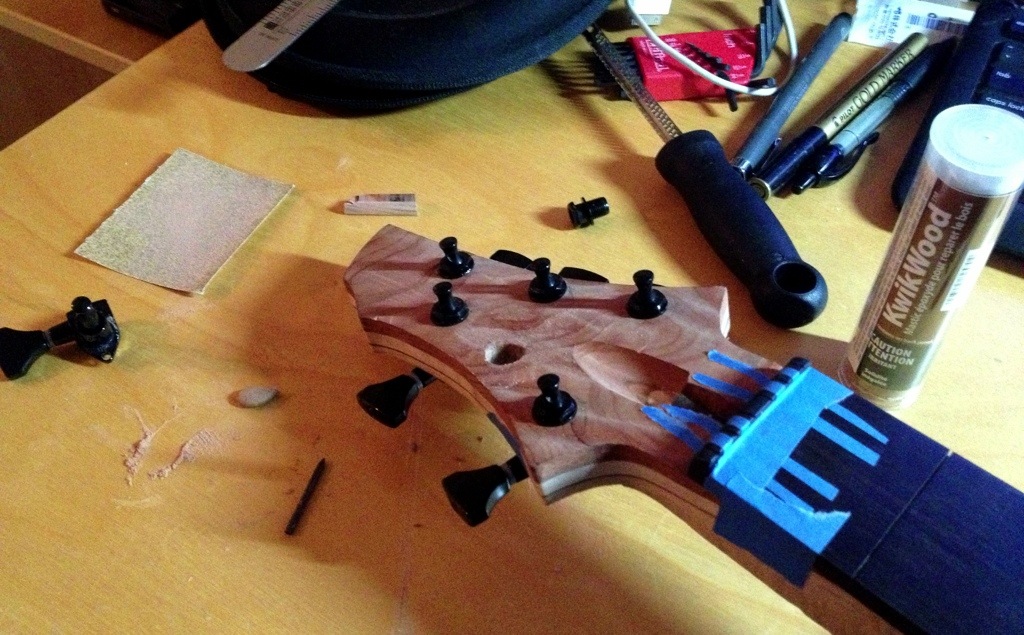 So one of the tuners was a few mm out of place and i wanted a way to move it over. So I took a small rasp and cut away then mounted the tuner expecting a small crescent gap to appear. The small gap I filled with kwik wood and redwood dust mashed together. I moulded it inside the hole so I can have some room to ream it to the proper size. So far it looks like a natural match!