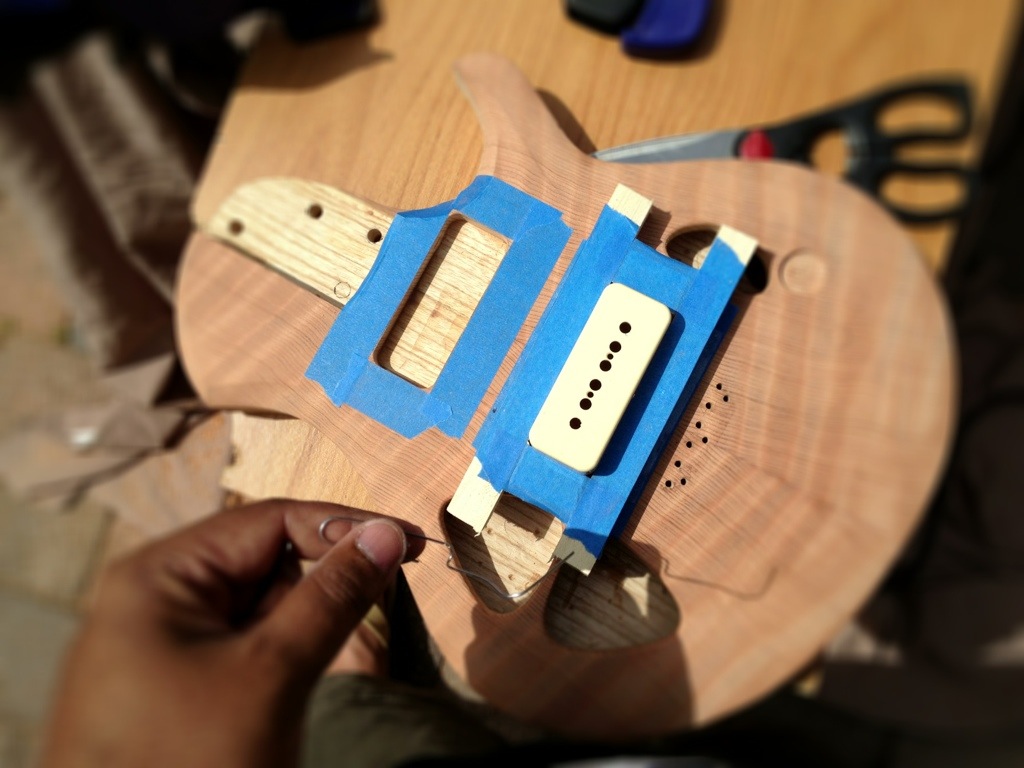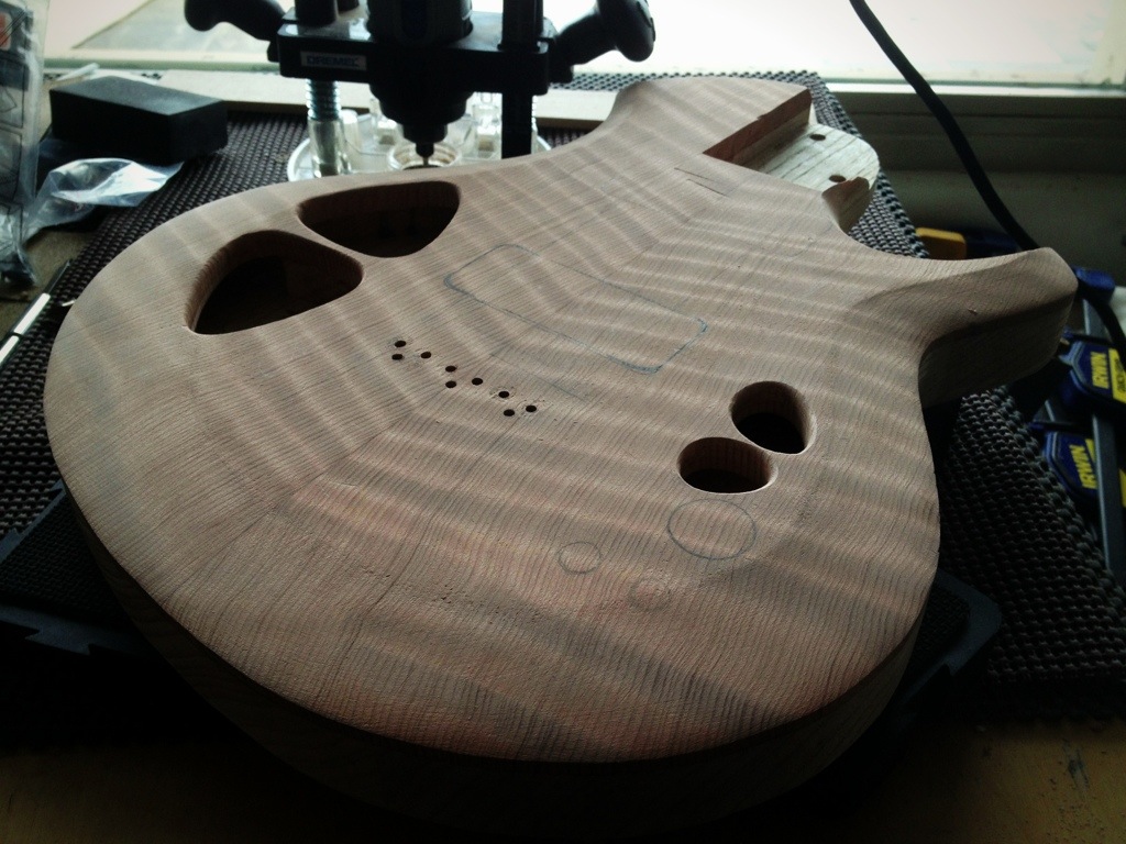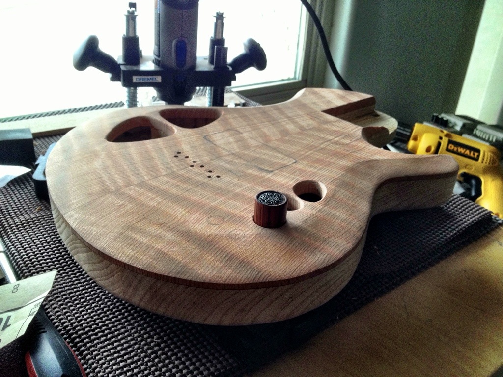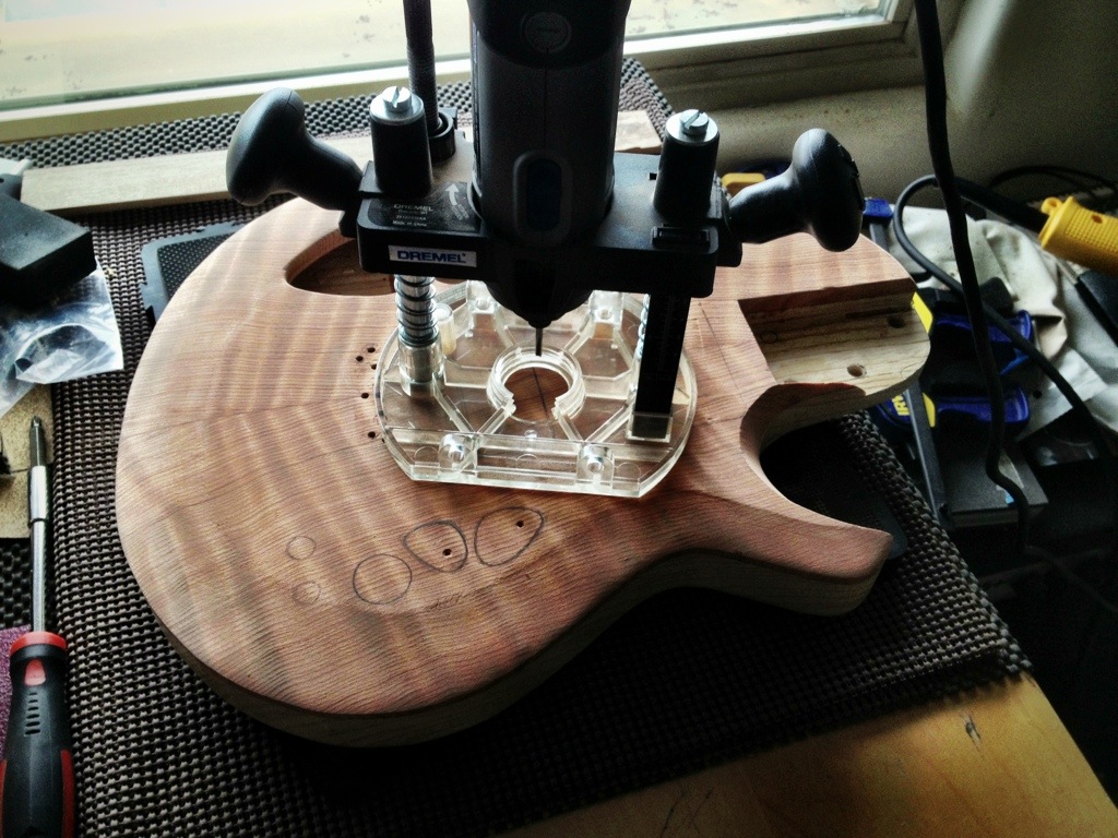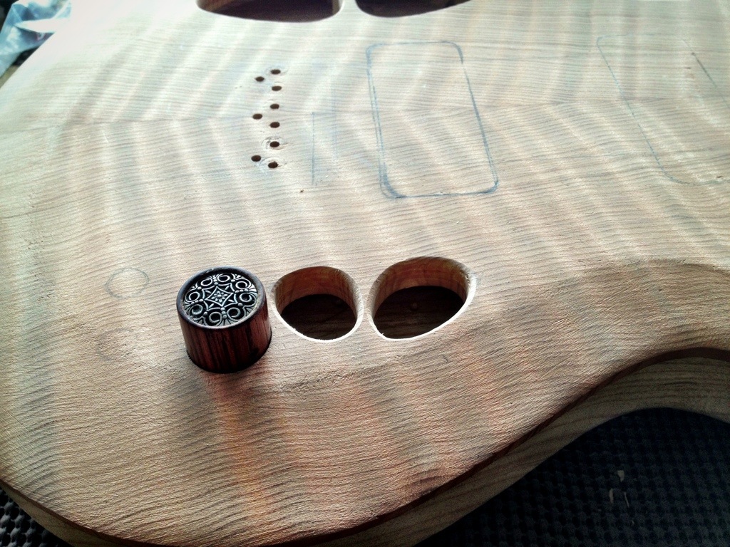 I’m really liking how this is all coming together. The tuner repair worked like a charm. The makeshift template I made with some pine sticks worked flawlesslyfor the routing of the pickups. The stew mac routing bit (the larger one) was perfect for the rounded corners. I like the way the additional sound holes look. As I suspected the tap tone and resonance are now equal for both sides. I’m really eager to hear this all strung up.