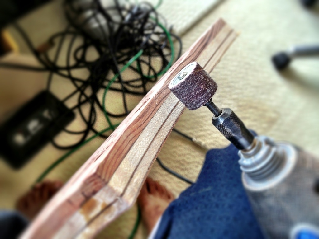May 7, 2013May 7, 2013 Peghead Veneer Glued and Shaped I used the same redwood burl veneer that i used for the control cavity. I glued it to both the back of the pegged as well as the truss rod cover. I think it looks pretty cool. Share this: Click to email a link to a friend (Opens in new window) Email Click to print (Opens in new window) Print Click to share on Facebook (Opens in new window) Facebook Click to share on X (Opens in new window) X Like Loading... Related