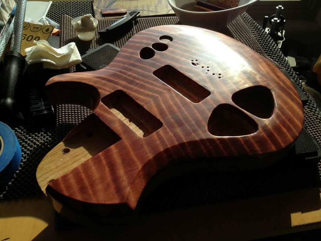 I sanded the body with 1500 just to see how much it’d take of since I wanted to slow down. I like the gloss in getting an don’t want to make it too thick a finish. Tomorrow will be the last couple coats before I let it cure while I’m away. Hopefully ill be able to get the neck carved and ready for finishing tomorrow as well.