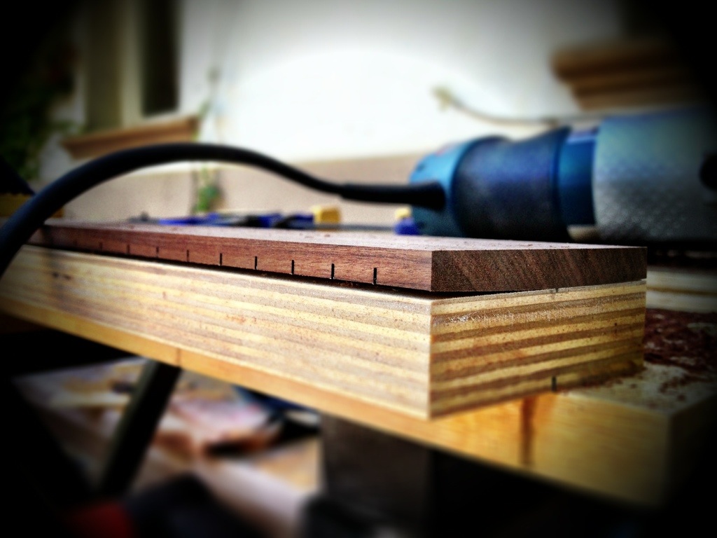 I’d made some templates for the fretboard and neck and decided to give them a try. The first attempt was frustrating. I’d made the mistake of my factoring in LMII’s space behind the fretboard. So basically I ended up with a wider nut end than expected. No biggie but not what I wanted. Second turned out much much better. Both are two gorgeous pau ferro which has a nice spicy smell when cut.