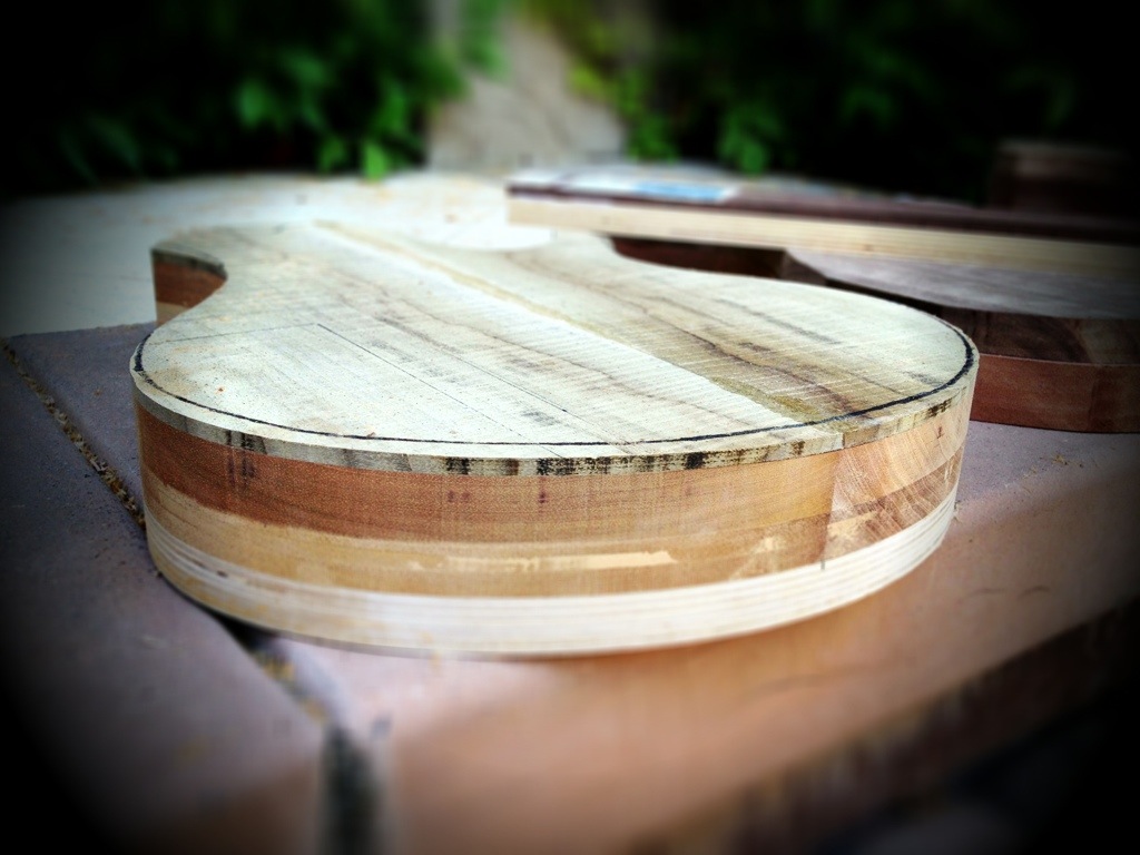 I also was able to cut a binding groove in the rustic maple burl topped guitar. I figure why not try it out. I’m going to use either black or white boltaron bindings. The figured walnut one is gonna have a white binding also on the fretboard and body.