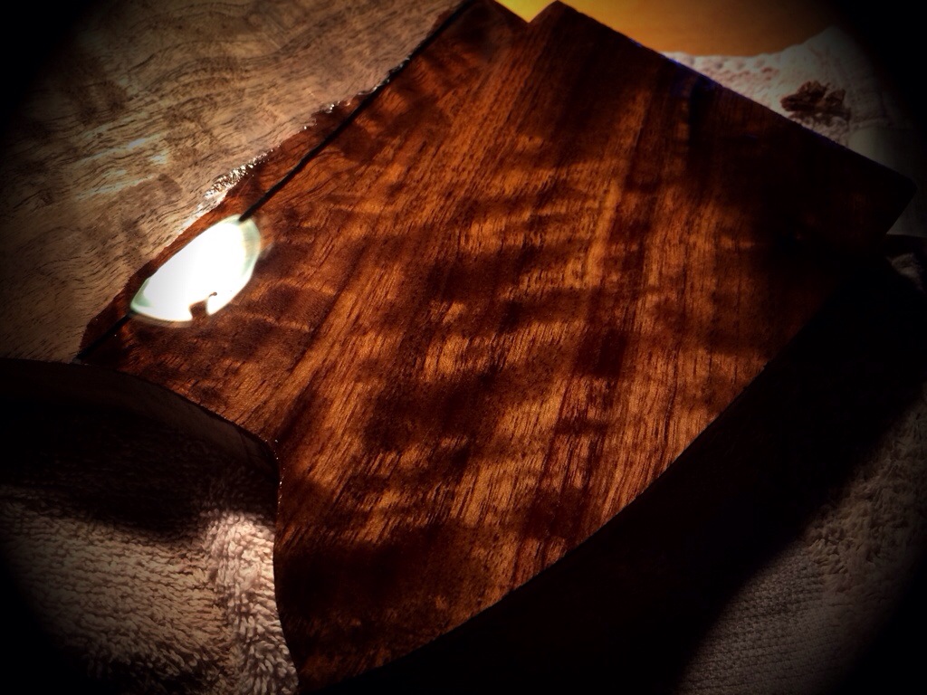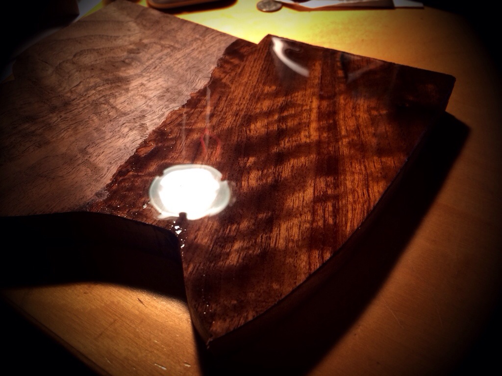 So I found my bottle of watco teak oil and I decided to apply the initial soak coat of oil. I usually just let the oil pool on top for a bit so it can saturate the wood as much as possible. Then I’ll wipe it off and do the same tomorrow while sanding with a fine grit. This will allow the oil to mix with fine sawdust and clog the pores. Later on after multiple coats I’ll apply a carnauba basalm wax to coat the piece. It will not be glossy but a nice warm satin shine.