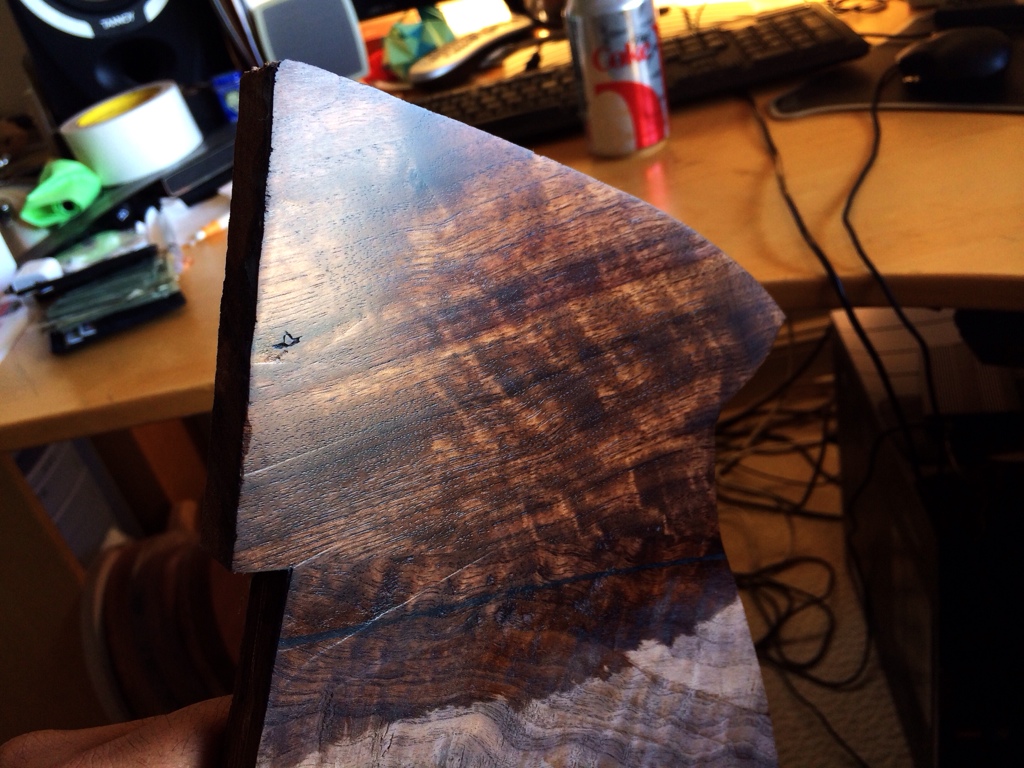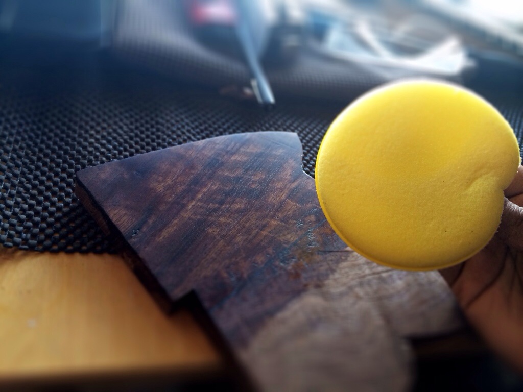 I swirled the yellow pad over the block of wax and wiped it into the surface of the wood like Mr. Miyagi. I then let it sit for a while then buffed it using some elbow grease. This is what the finished surface looks like. I really really like this look. It feels very smooth but still feels like wood; not like a plastic poly finish. It doesn’t have a reflective gloss, but that’s not what I’m looking for. We’re going for depth and chatoyance here. Basically enhancing the natural beauty of figured walnut.