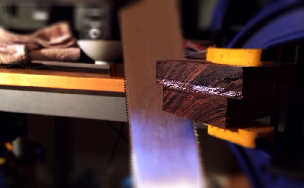 Had to square off the heel end of the neck. I used my Japanese Ryoba with the cross cut side against a flat block of wood as a miter. Check out that clean cut. You’ll never get that kinda smooth finish cut with an American saw.