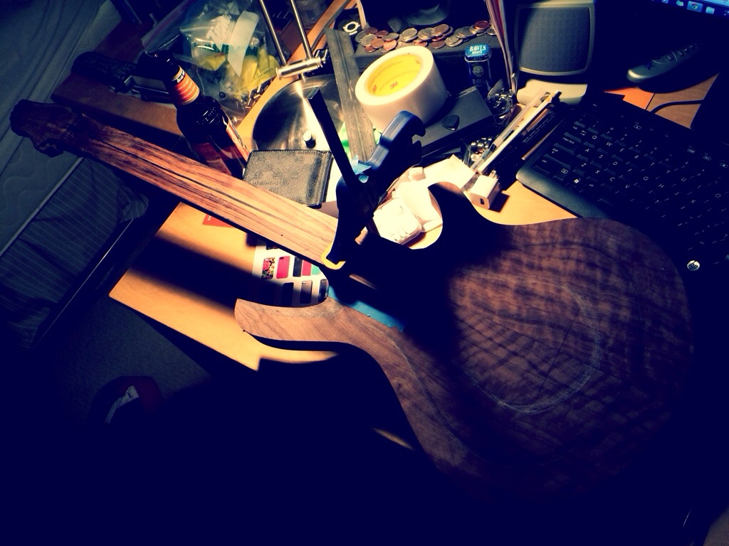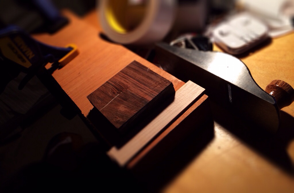 Next I’m planning on trimming a chunk off the mitre block to use as the missing ear for the headstock. I’ll then glue and plane the entire headstock down (2mm) until I have enough room to accommodate the decorative veneers I usually incorporate.