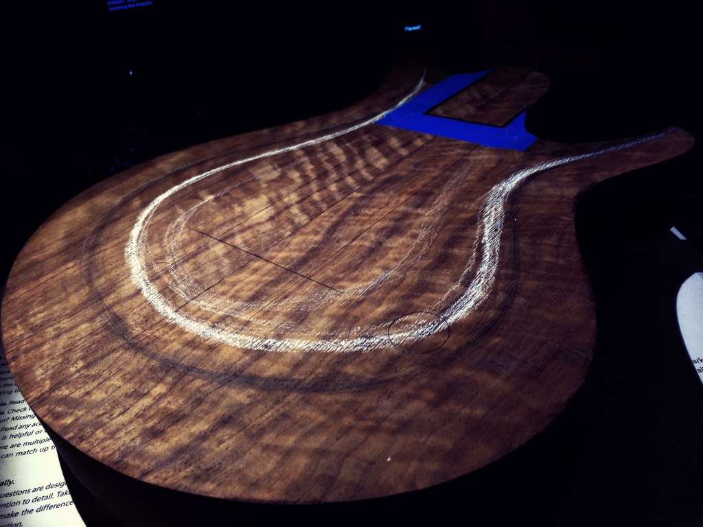 I also need a gauge that’ll tell me when to stop carving around the body so I pencilled that in as well as the volume knob recess. I also marked the input jack area but I don’t think I had a picture.