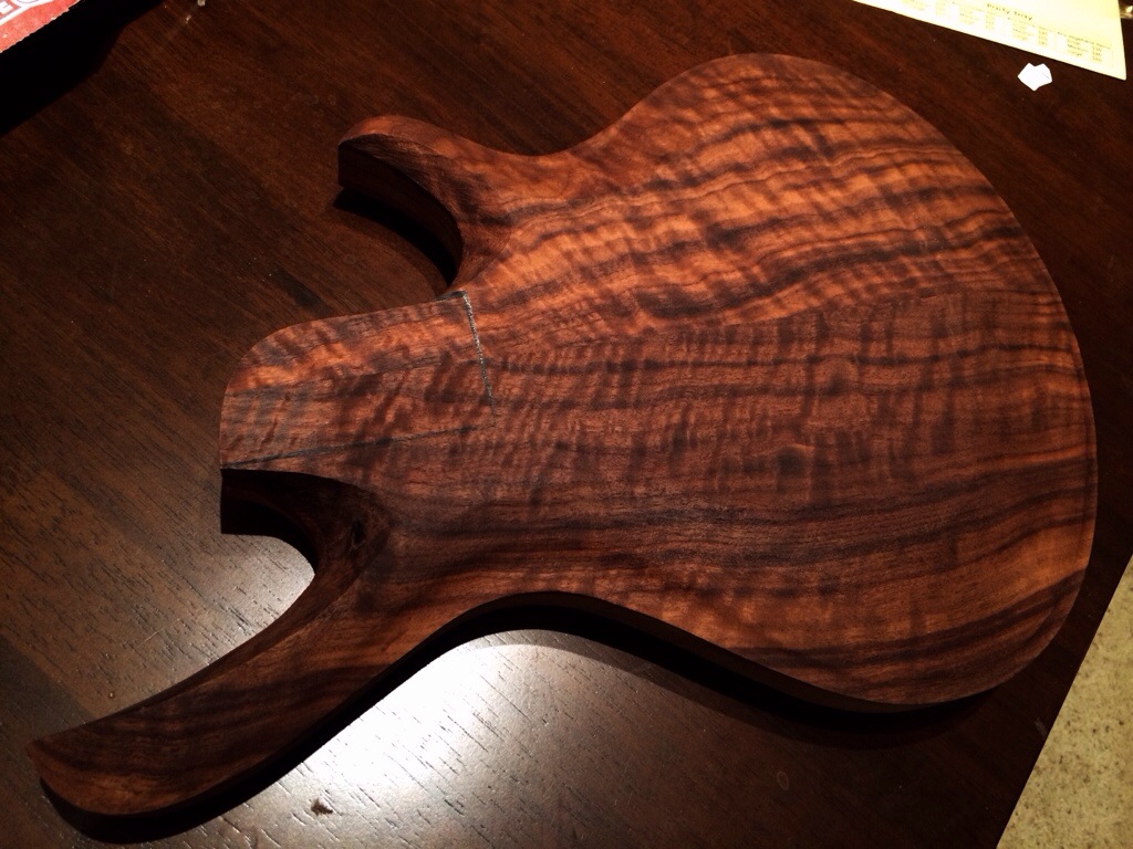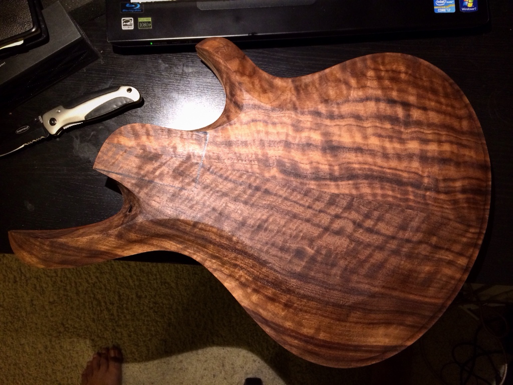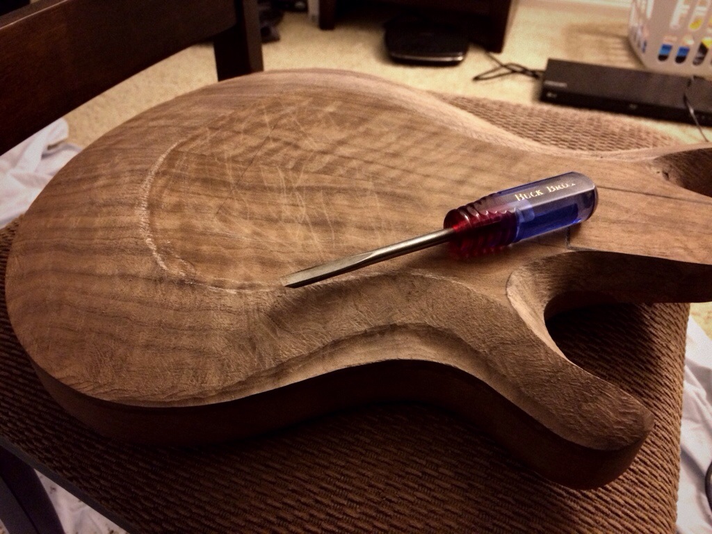 Ok so I got a carving kit and went at this by hand to make this contour top, an archtop. It took me all of the chronicles of riddick to get this done. I still need to smooth out the base transition and finish sand the body. So far I’m working cleaner than I have before; that makes me happy.