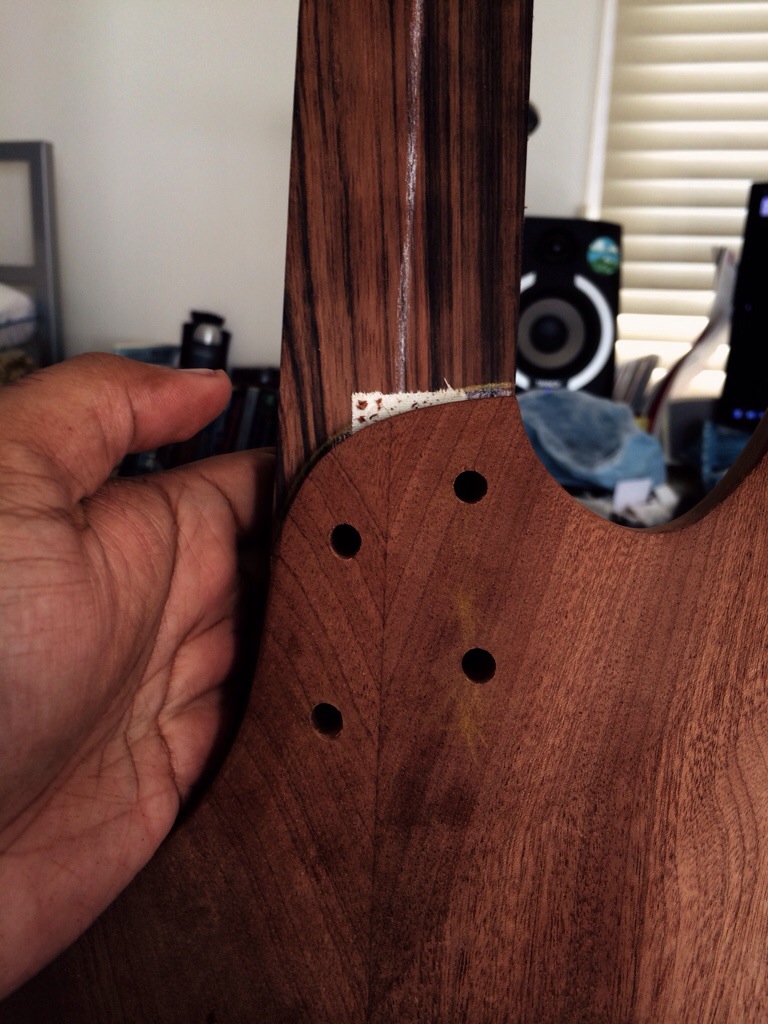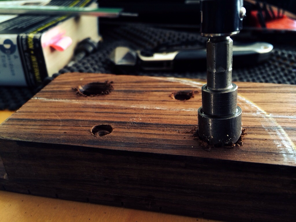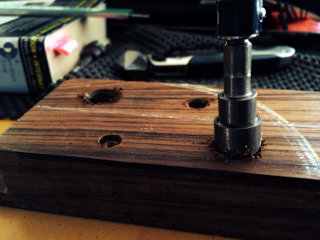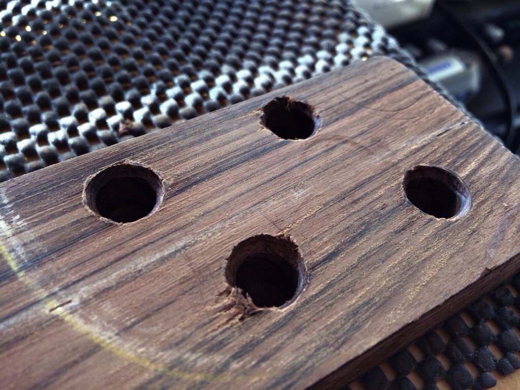 This was easier than before. I clamped the neck and drilled 1/4 in pilot holes through the back and so they left a divot in the neck heel. The neck heel was then drilled with a 13/32 drill bit for the stainless steel inserts.