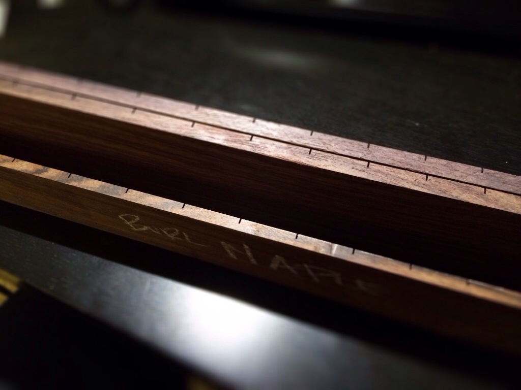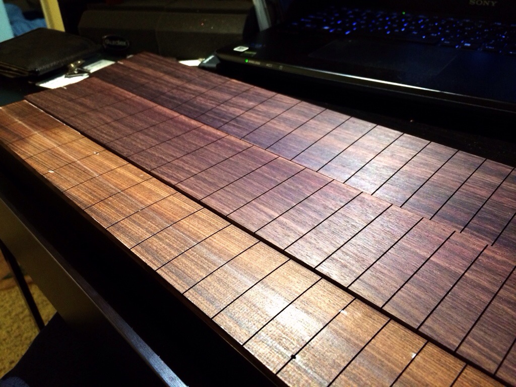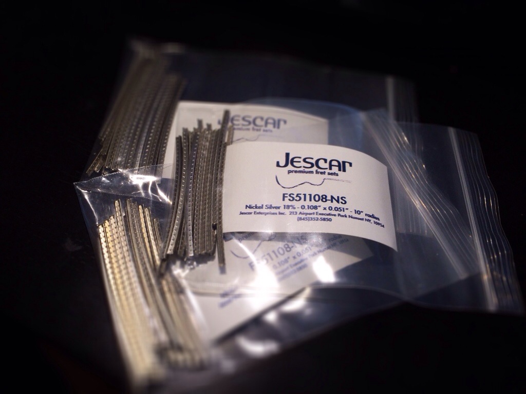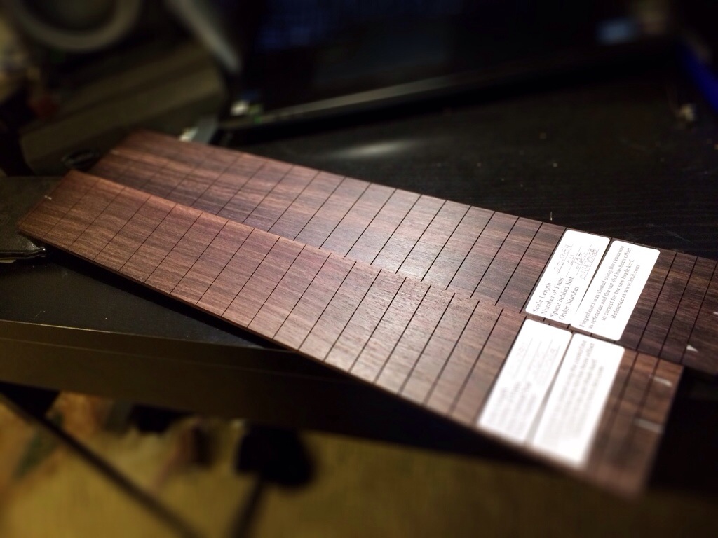 Got two packages in the mail today, my order of three packs of Jescar Frets, which are pre bent to 10′ and pre cut. I also received my package from LMII, which is a pre slotted dark Indian rosewood fretboard x2 and a freaking giant radius sanding block. The boards are pretty thick as well, there’s a picture comparing the Indian rosewood ones to the pau ferro board going onto the burl maple build. The sanding block’s got 16′ on one side and my usual 20′ on another. Just waiting on two more truss rods and a 16′ brass insert for my fret press caul.