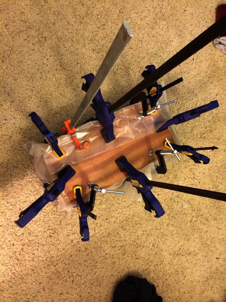 Started this today after gluing up the walnut flat top body. I’m gonna sandwich a piece of poplar as a contrasting piece in between the walnut and sapele. I still need to joint the body so I figured I’d just glue the poplar to the body and then joint it together. This time I’ll try not to forget to route the wire channels like I did with the roasted maple one. To save time I literally stacked both halves on top of eachother and separated the halves with wax paper. I’ll check it tomorrow and see how it turned out.