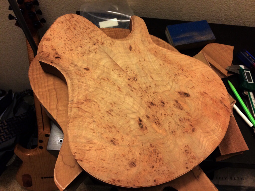 Carving the maple top took some time because I was constantly distracted with the reboot of the cosmos show now featuring Neil Degrasse Tyson. He’s just perfect for the part and Sagan would be proud. I’ll attack this thing again tomorrow. I’d originally routed a binding channel but had the idea to just use that ledge as a depth stop to tell me where to stop carving. It’ll also assure a uniform lip on the large bottom. The way I like to carve this is with the most distinctive carve at the waist on both sides then have it taper off a it goes around the bottom. It takes some time but after the most recent build I think it’s worth it.