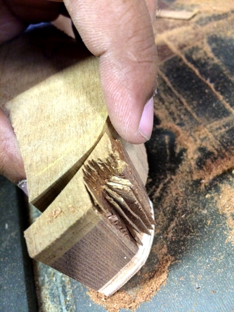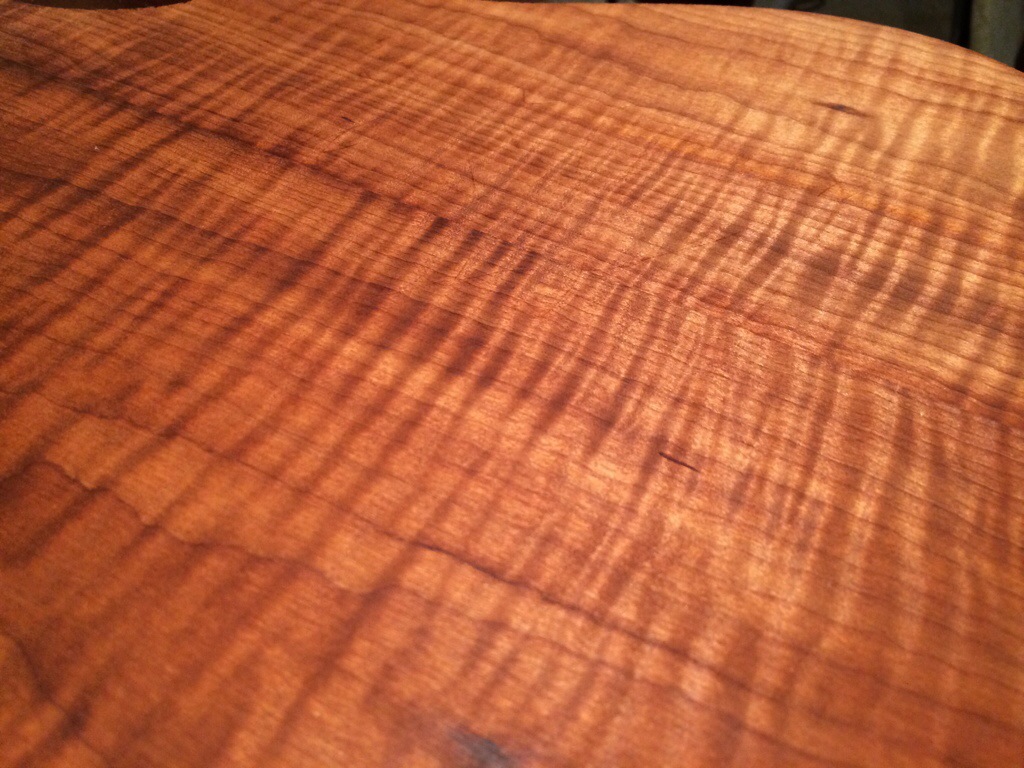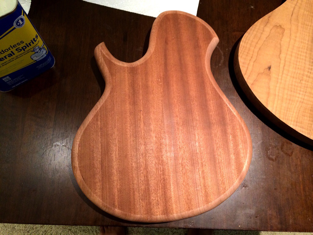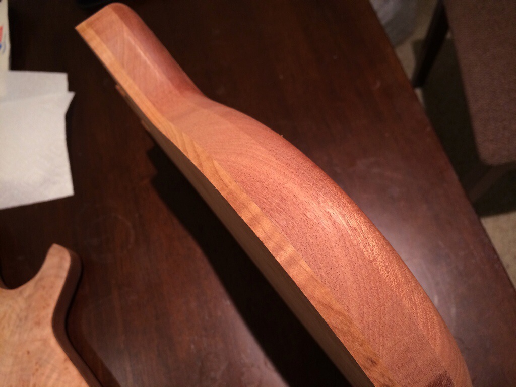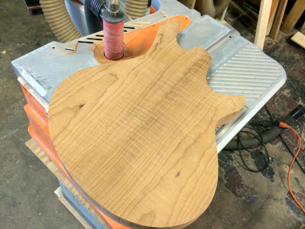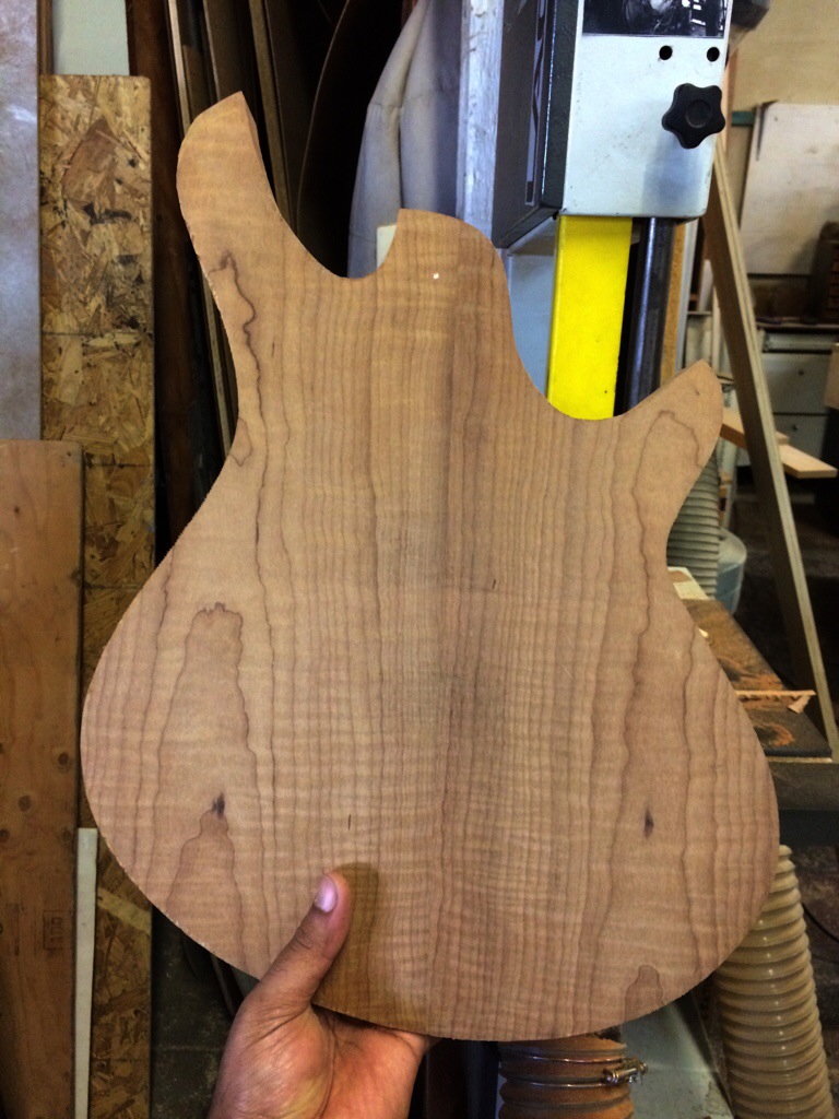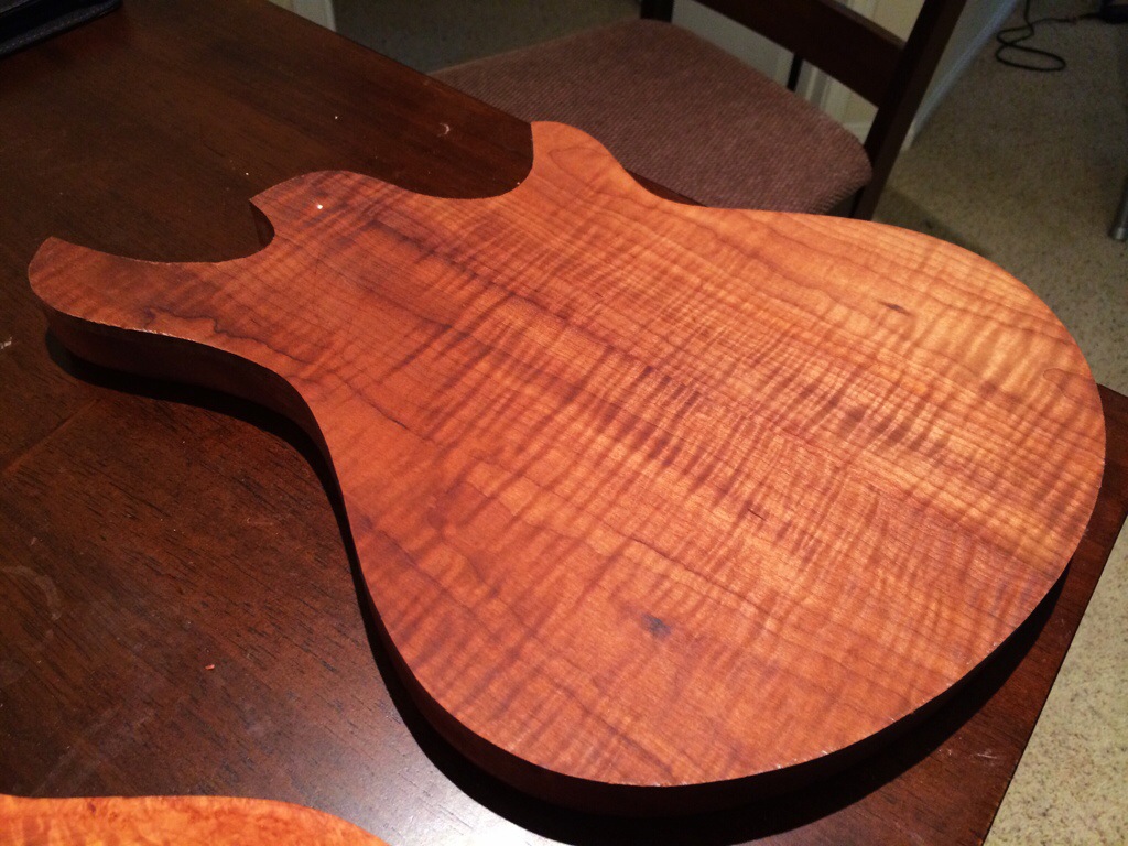 Had a scare today. I fed my roasted maple guitar into the router table at too acute of an angle and the top horn just burst. After looking at the damage I just sawed off as little as possible to rebuild the horn. It’s smaller but still looks great! Better yet I now have two templates; one with a long horn and one with a short horn. I then sanded the body on the oscillating sander and rounded the back with a round over bit. I did the same to the burl maple build. After that I took those two thick headscarf pieces and Bandsawed them in half so I can use them later. Burris helped me joint the poplar middle laminate+sapele body one the table saw. This will receive the flat mild figure walnut top.