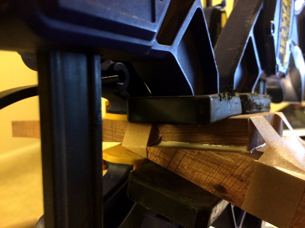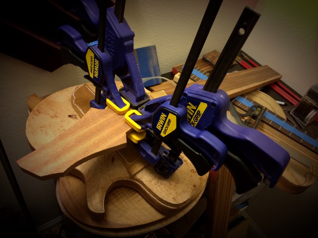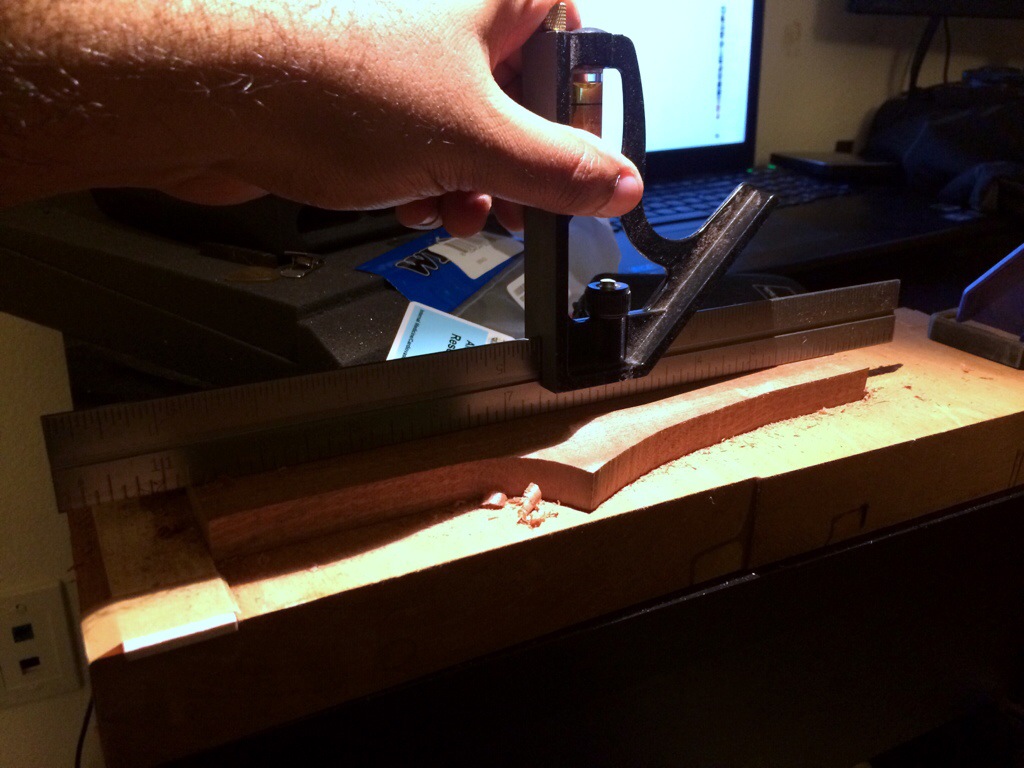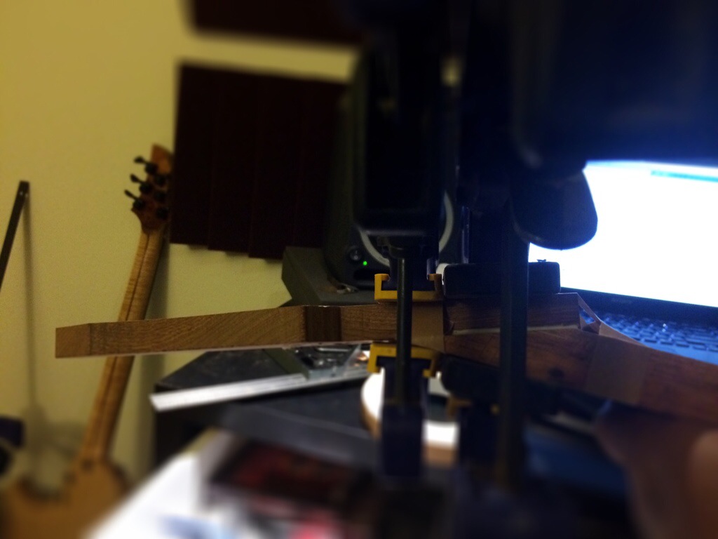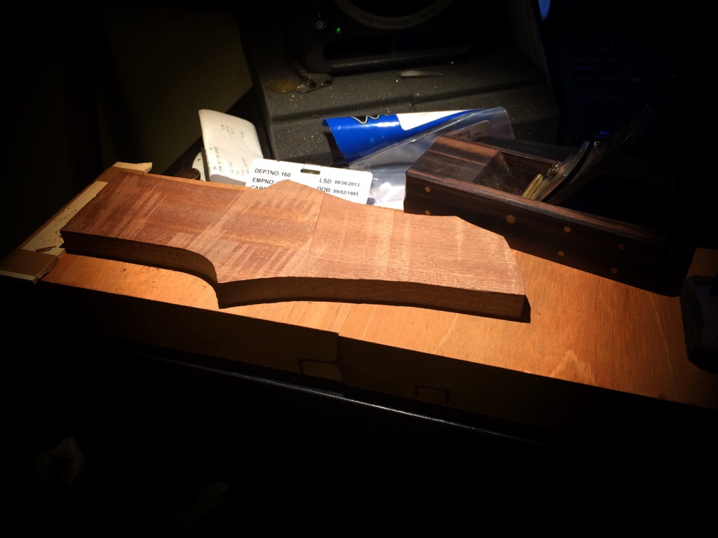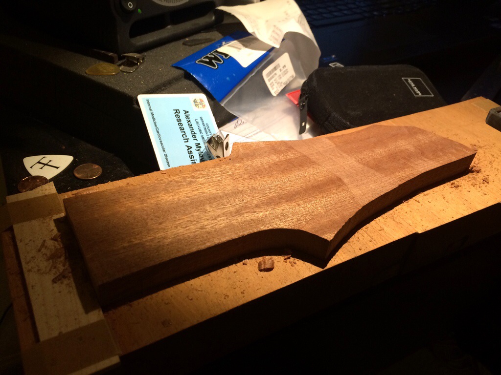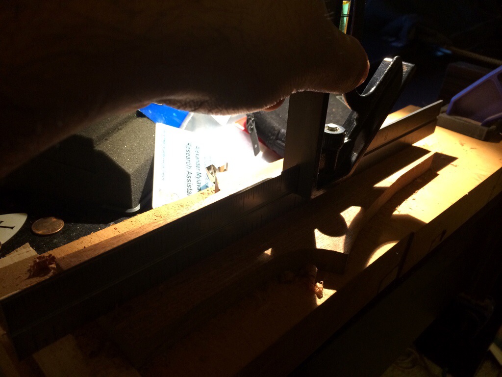 Couldn’t sleep so I made a shooting board and went to town on some head scarf pieces. Once they were trimmed using Anthony Murkar’s plane, I glued it to the rosewood neck. I used to cut the scarf on the small piece as well but I realized this method would eliminate the possibility of the piece slipping, which would require you to plane the entire surface of the neck down. Instead, I just shave away at the protruding part until it’s flush with the surface. It works perfectly.