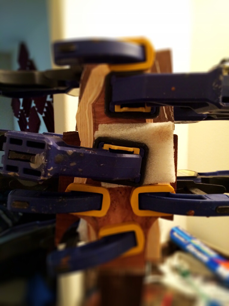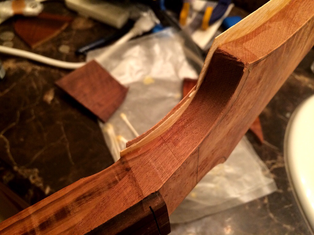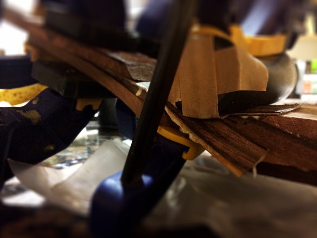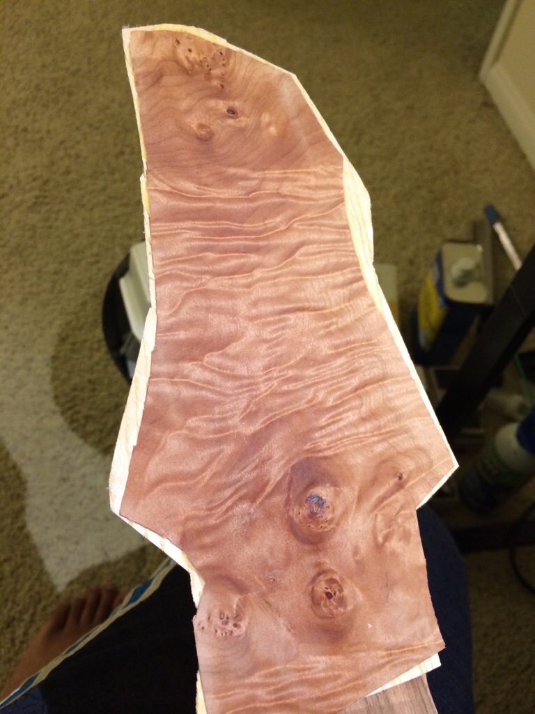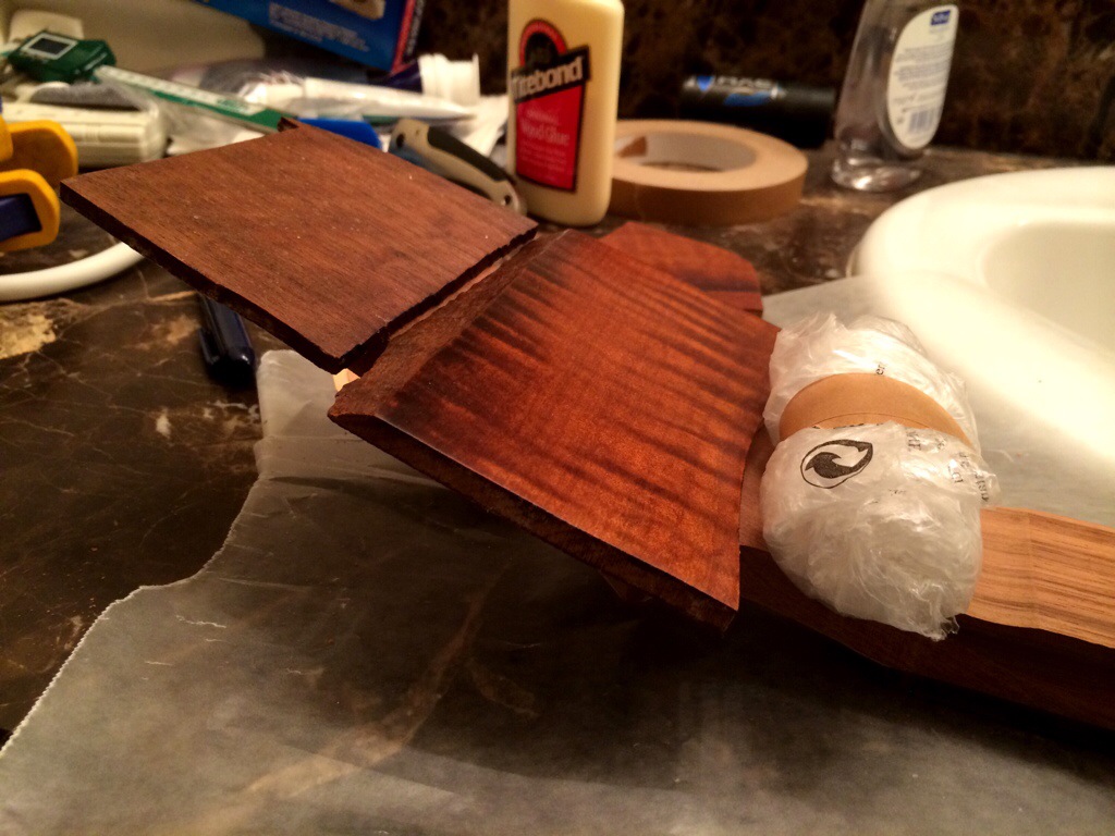The three ply veneer I made for the roasted maple build was absolutely too stiff to bend. I figured I’d give it a shot to hear the bottom part and to slowly bend it into shape. I sprayed some water and ironed it until it would Bend into shape with some force. I’ll see how it all works out tomorrow. I’ll probably go back into the shop Sunday after I radius the board to press frets and route neck pockets. That will make these builds nearly completed; as far as rough woodwork goes. Then comes the sanding and sanding.