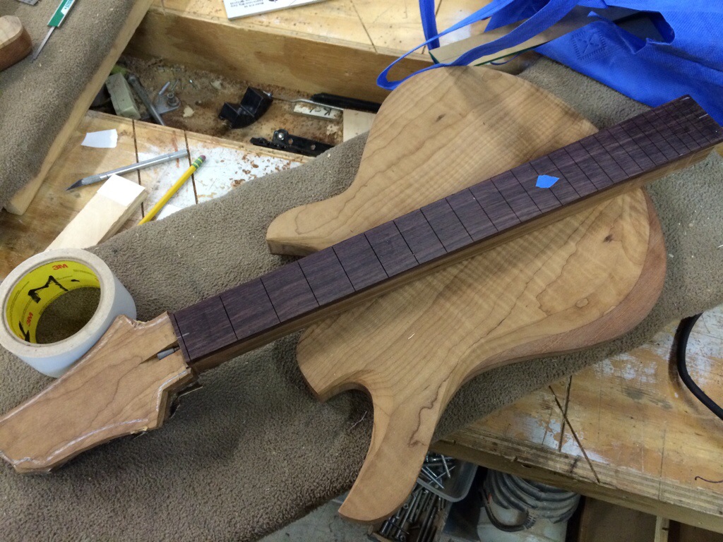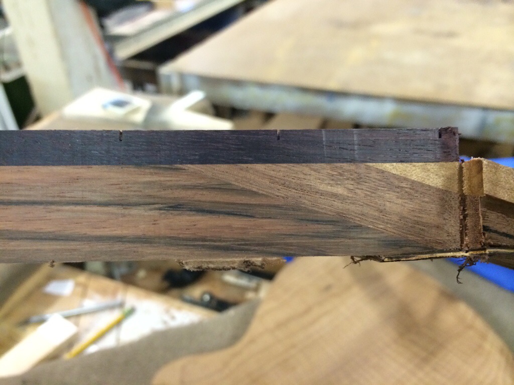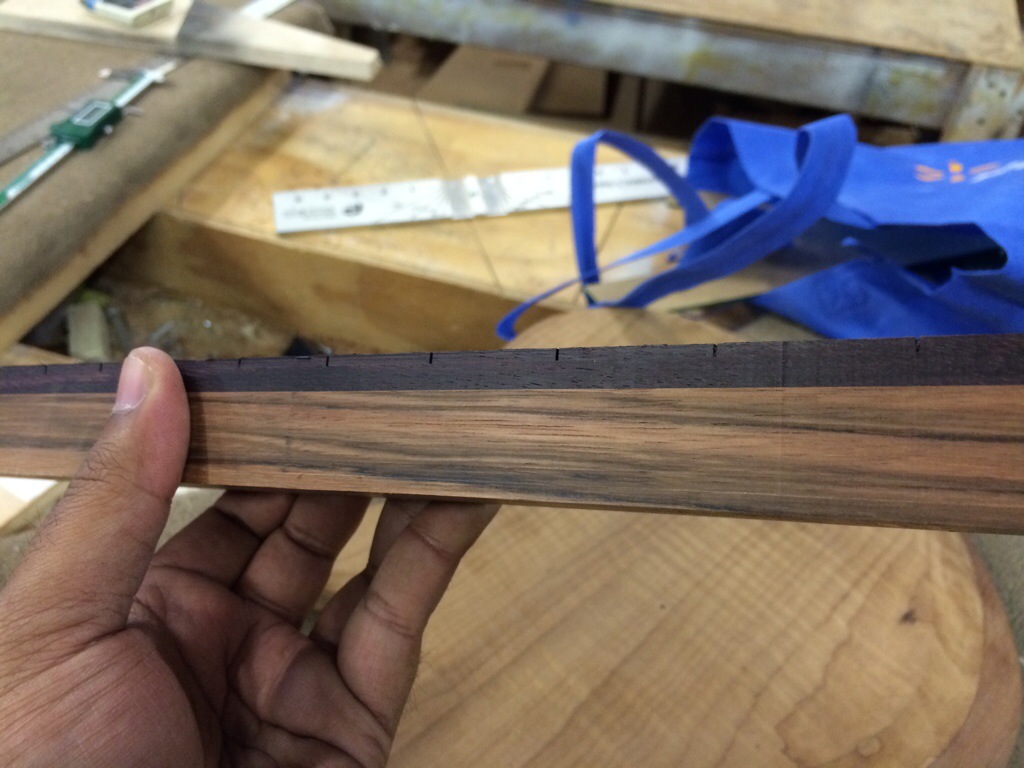 I also have my own little drawer here! Yay! I routed the roasted maple’s neck flush and saw the beautiful dark purple rosewood cleanly cut alongside the monterillo. It’s gonna be a beautiful neck. Not to mention the fretboard is just gigantic