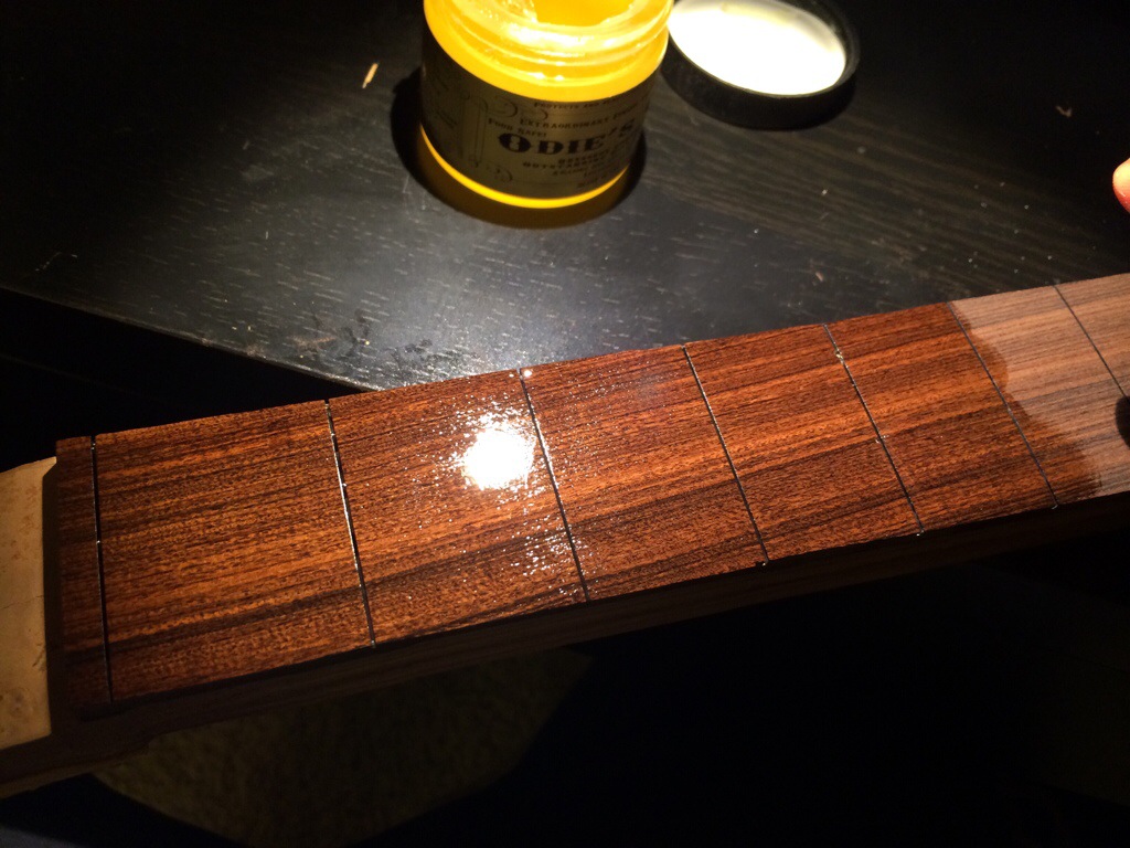 Figured since this was the last of the pre-radiused stock old just get it over with. The LMII large sanding block works perfectly with the stew mac fret press caul insert. For some reason I had a problem with the 8 in sanding block matching up with the same caul but this works perfectly. I sanded up to 400 and stopped because I liked what I saw. I rubbed with 000 and 0000 synthetic steel wool and applied odie’s oil. Typically is just use Danish oil but I decided since I bought this to try out I might as well use it. It’s got a whole lot of marketing hoopla on it and claims to be food safe and amazing.