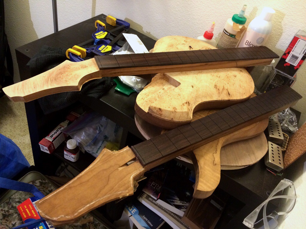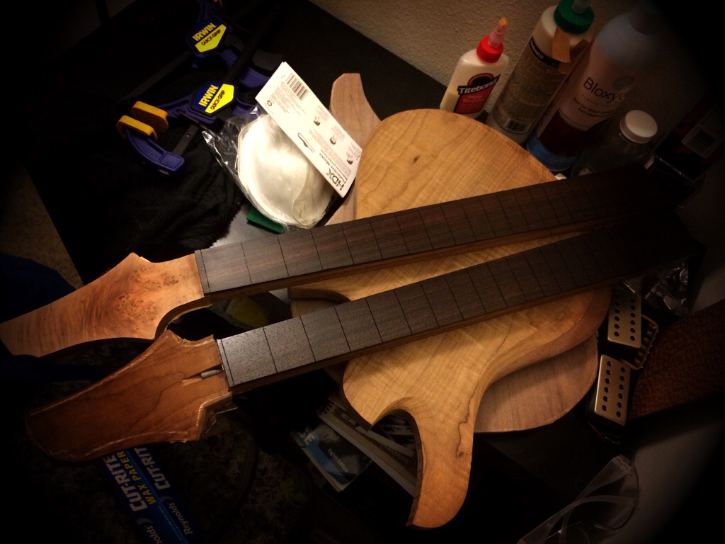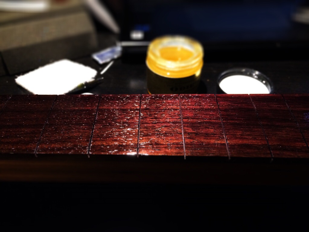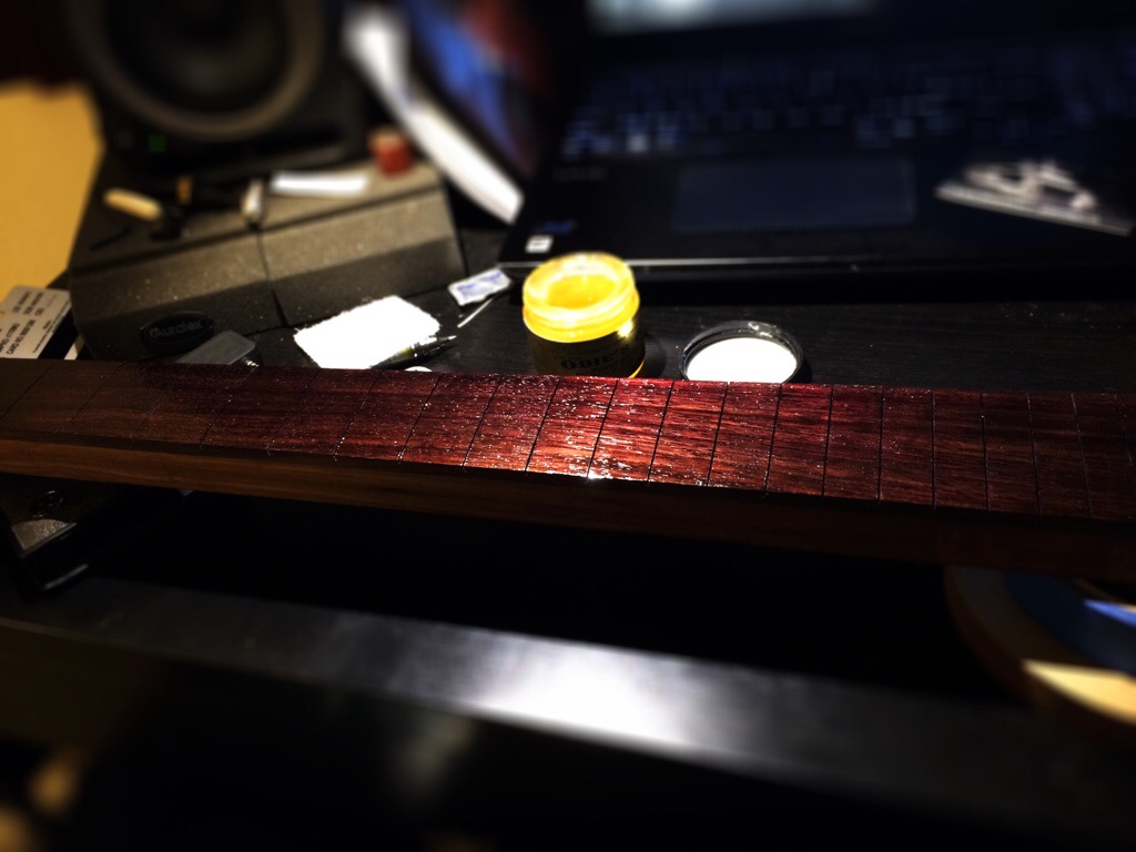 Either way it came out great. The Indian rosewood boards have this gorgeous jewel like purple hue with really nice highlights. I did the same as I did with the last fretboard using odie’s oil and steel wool. I also waxed the burl maple necks fretboard with trewax. Tomorrow I’ll do the same for this fretboard. Then it’s off to fret and drill inserts and peg holes.