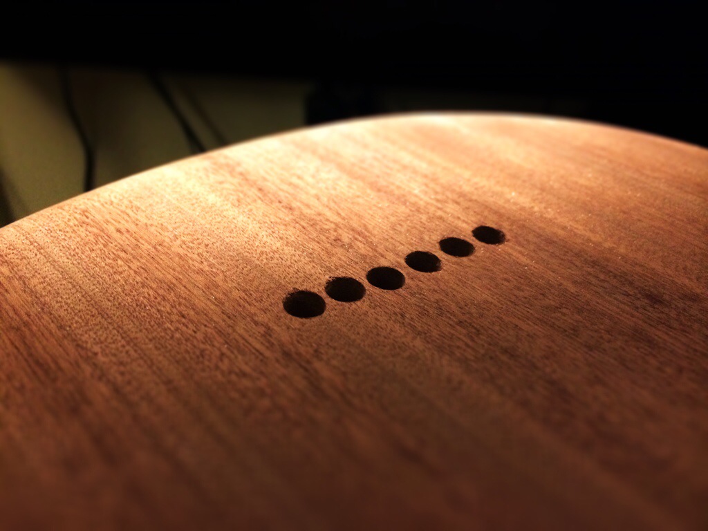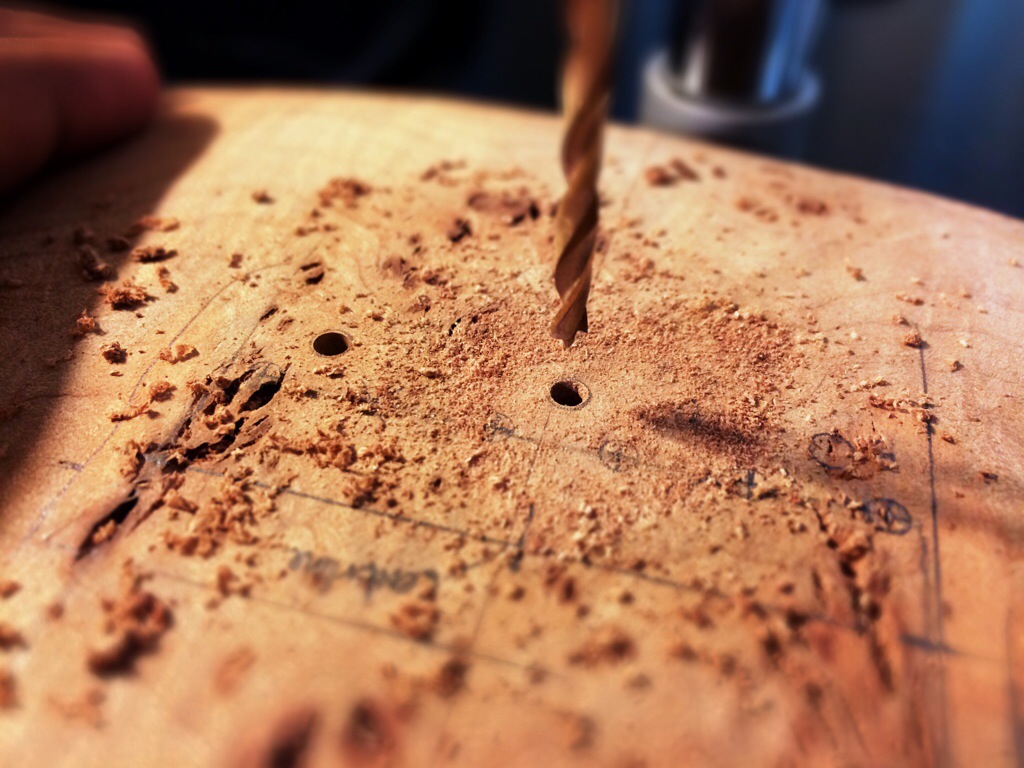 Mounted the tuners to see the string path and marked the area for the bridge. I drilled the holes 90% of the way with the smallest drill bit for the dremel and then used the same sized bit from my hand drill set to complete the hole. I then used a 5/16 bit for the ferrules in the back. They came out fine just two holes are slightly closer to each other.