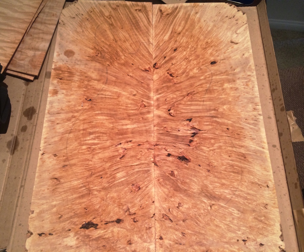 Got these in from FV fine woods in Canada. The thin quilt top will be glued to the walnut top I have laying around. That will be the top I dye for Roger Pottanat’s semi hollow build. I’ll announce details for that later. This burl top is just spectacular in person.