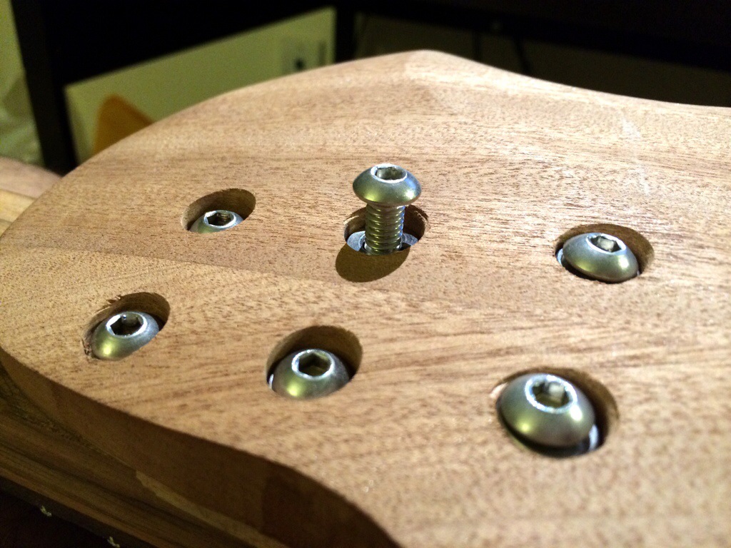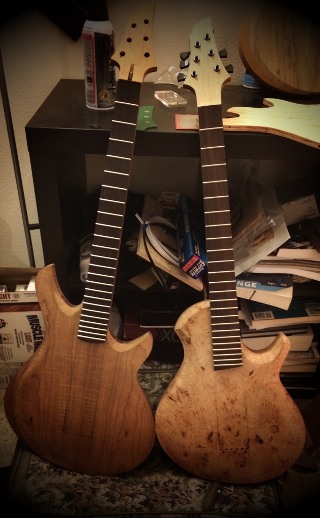 The roasted maple build is nearly caught up to its brother. This weekend I’ll drill the bridge holes and align the tuners. I filled the burl bridge holes so I could move it over 2mm. I’ll re do that then map out where the pickups go. If I can work it out with a large sheet I might be able to route on the balcony. The heat outside is killing my motivation.