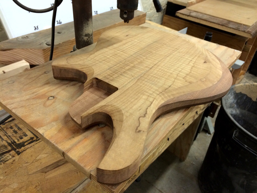 The first picture is me cutting the occurs from Rogers maple top to send to Aaron Brown, luthier of BlackWater Guitar Co. He will be making me a custom set of medium output pickups using those pieces of maple. Neck will be a p90 bridge will be a humbucker. I’m so excited. The shape is sleek and it’ll be a super unique touch to a special build.