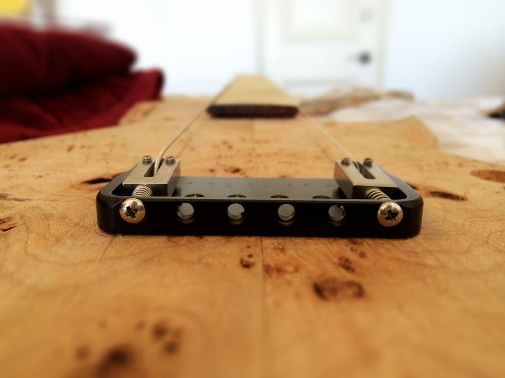 First I strung up the outer strings. moving the bridge over 1.5 mm was the right call and the strings line up perfectly on the burl maple. It was easier on the roasted maple.