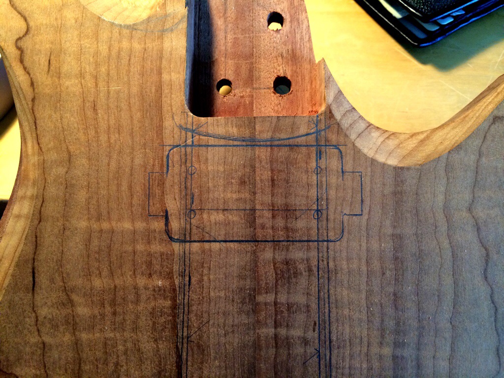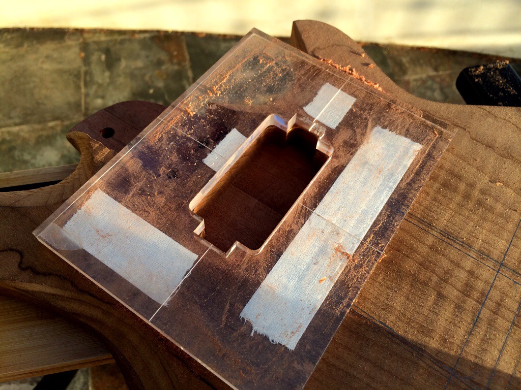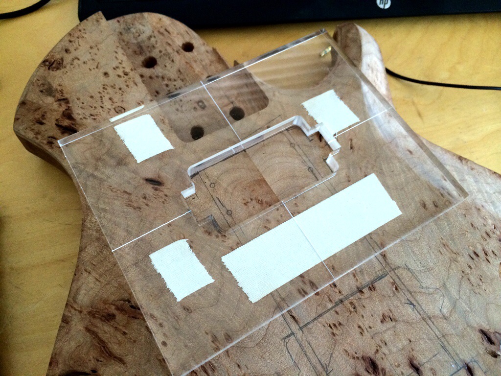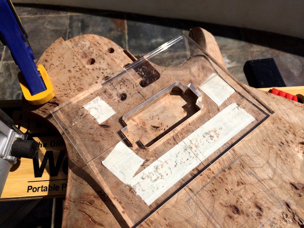 First I string up the guitars, drew the path of the strings and the outer holes. I’m kinda OCD about having the strings line up so this was crucial. Then I traced around the spare baseplate I have and then traced the template over it, notching the x and y alignment. Then I used lathe tape and went to town using the stew mac bits, first the big, then the small to sharpen up the corners. I maxed out the dept on both. This was alright for the roasted maple because it’s pickups have no legs, but I must have forgotten that the dominions came with 1/2 in legs which will require me to forstner some holes on the sides to accommodate.