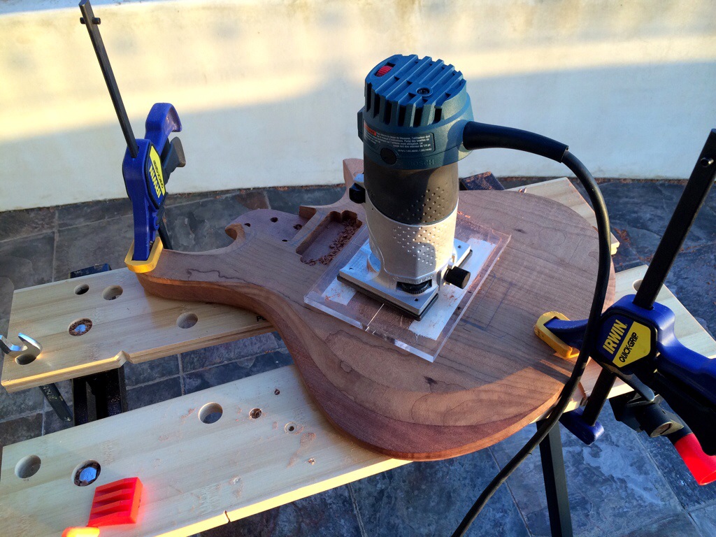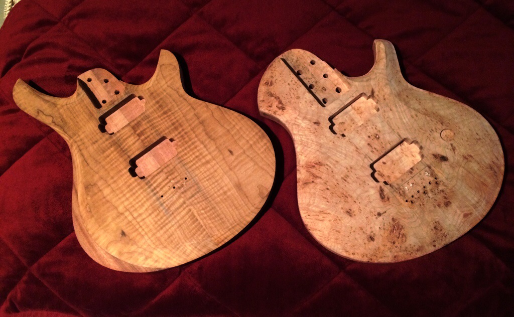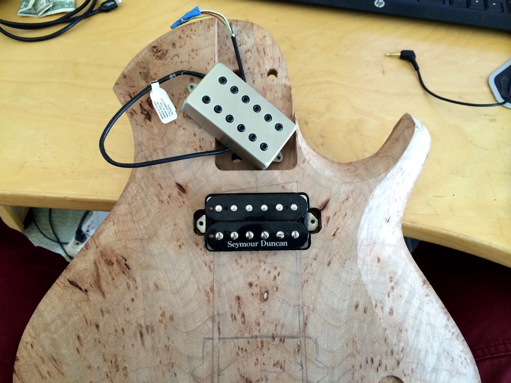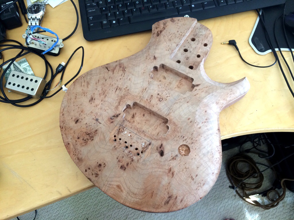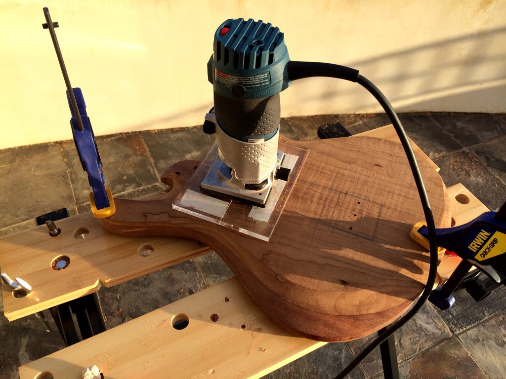 First I string up the guitars, drew the path of the strings and the outer holes. I’m kinda OCD about having the strings line up so this was crucial. Then I traced around the spare baseplate I have and then traced the template over it, notching the x and y alignment. Then I used lathe tape and went to town using the stew mac bits, first the big, then the small to sharpen up the corners. I maxed out the dept on both. This was alright for the roasted maple because it’s pickups have no legs, but I must have forgotten that the dominions came with 1/2 in legs which will require me to forstner some holes on the sides to accommodate.