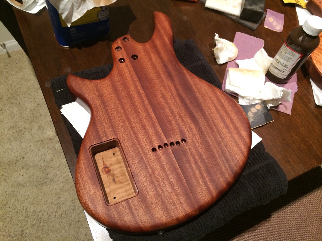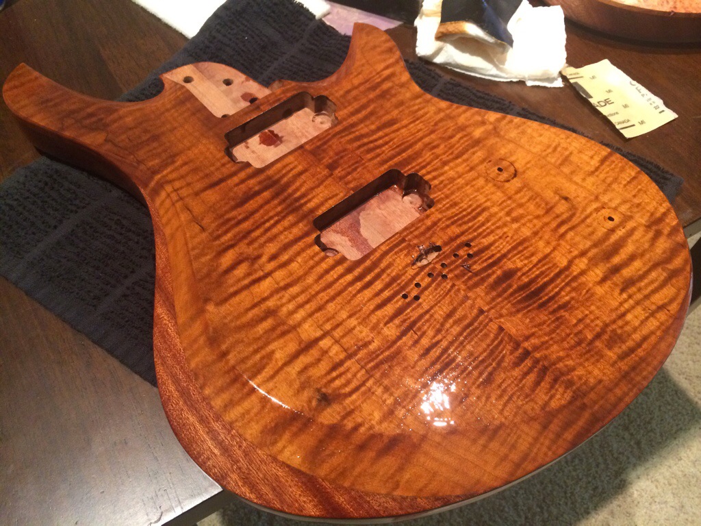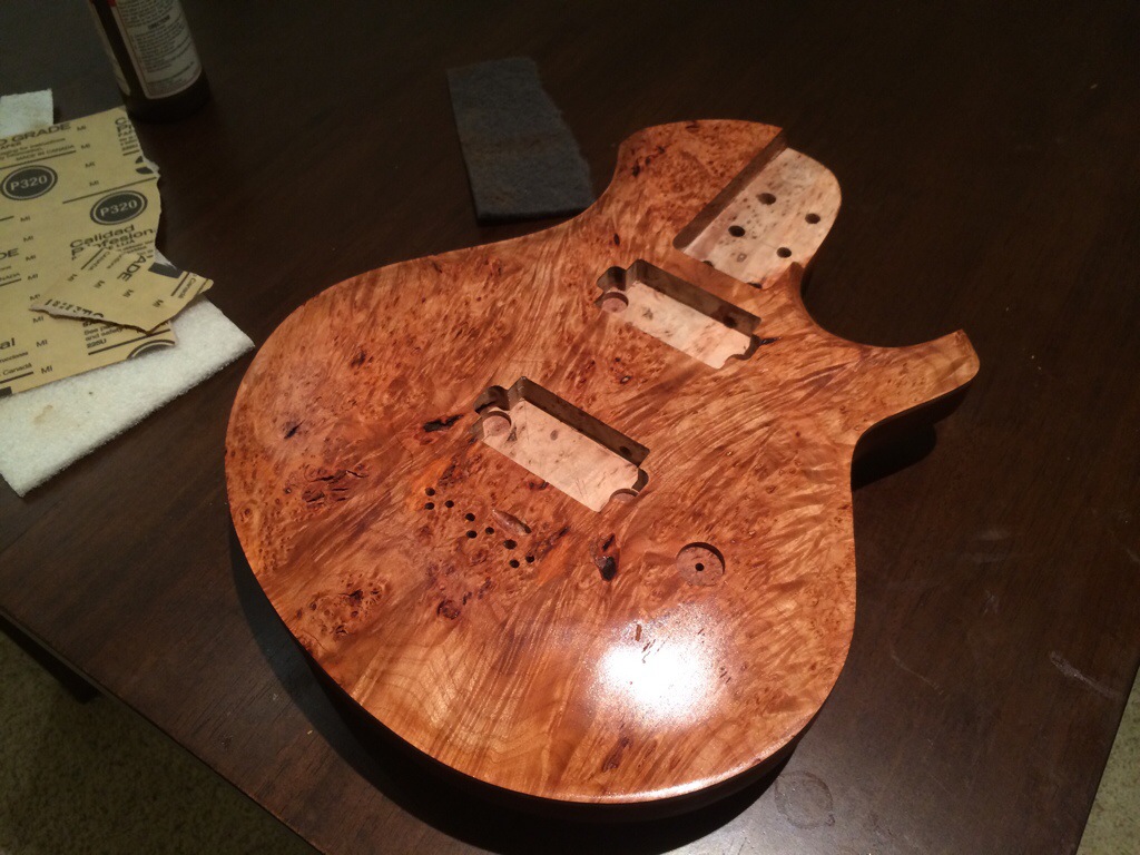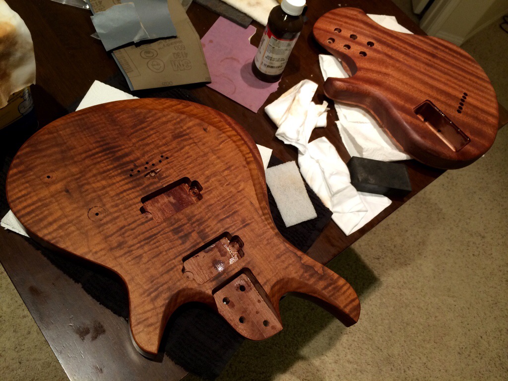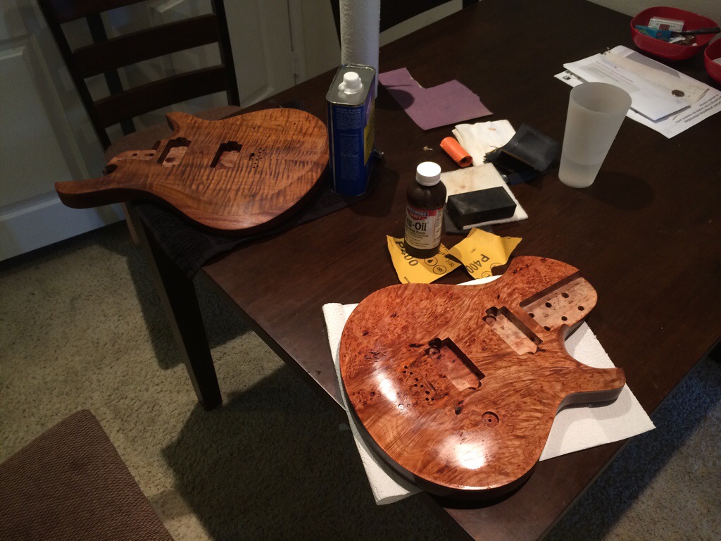 I’m trying a more deliberate approach this time with tru oil. Instead of going for a glossy top (which would look spectacular on the roasted maple). I wanted a bit more subdued, hand rubbed look, but with a glass smooth feeling. So I’ve sanded with oil up to 600 grit so far. I use enough oil and sand until I can’t hear the “scratch” sound of the sandpaper. My arm hurts but it’s worth it. I then let the oil set a bit until it’s super tacky. Then I wet a rag with mineral spirits which thins the sticky top and wipe most of it off. The end result is pretty much what I’m after. I’ll put on one more glaze coat tomorrow and then let it dry for a few days while I finish carving the necks.
