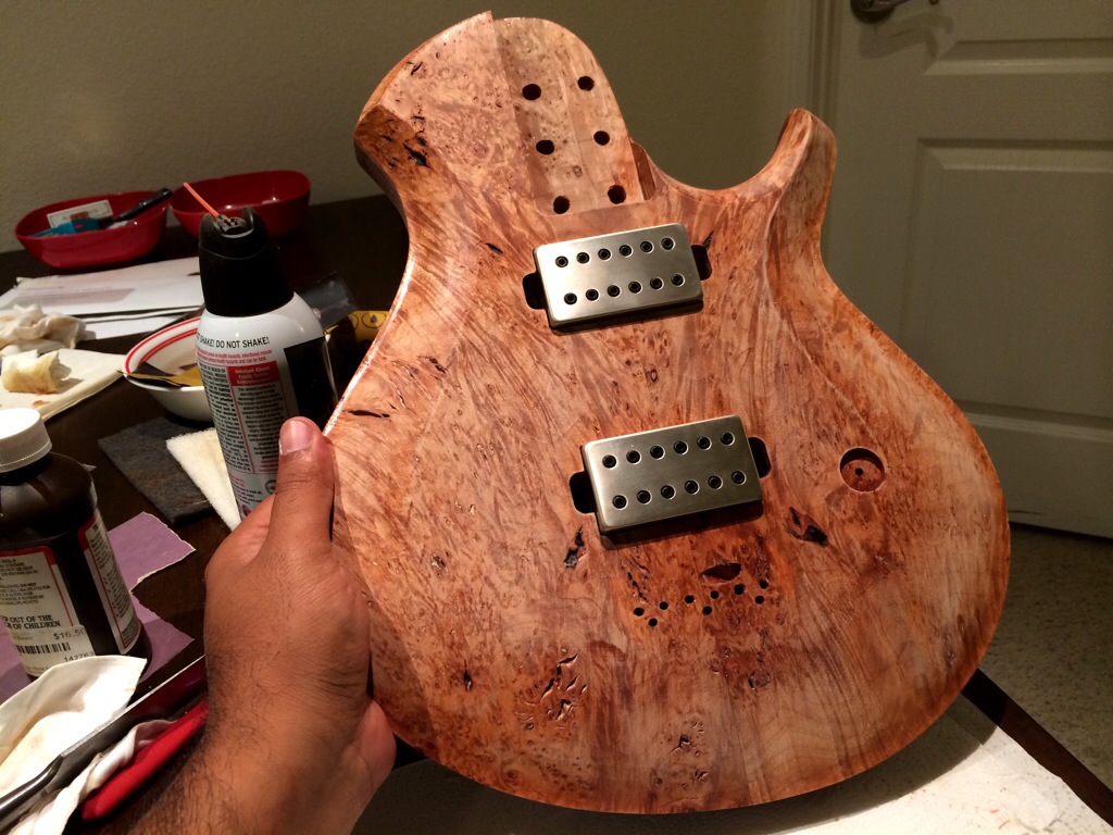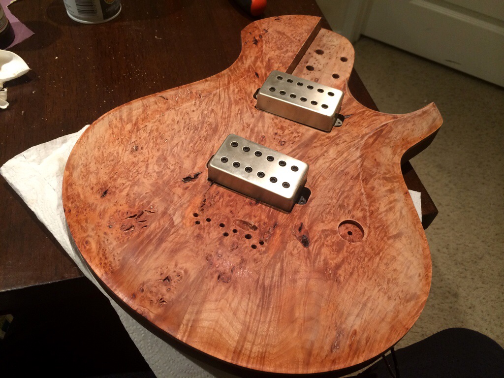 Joel suggested I route out a hair more using my template. I did that and carefully chiseled the sides a bit to fit the stupid fat dimarzios. Now it looks nice.