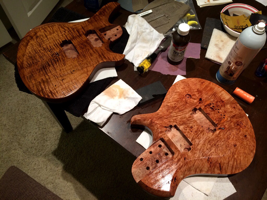 I added another coat of oil on both after work. For some reason the burl maple kept drinking the oil up again.