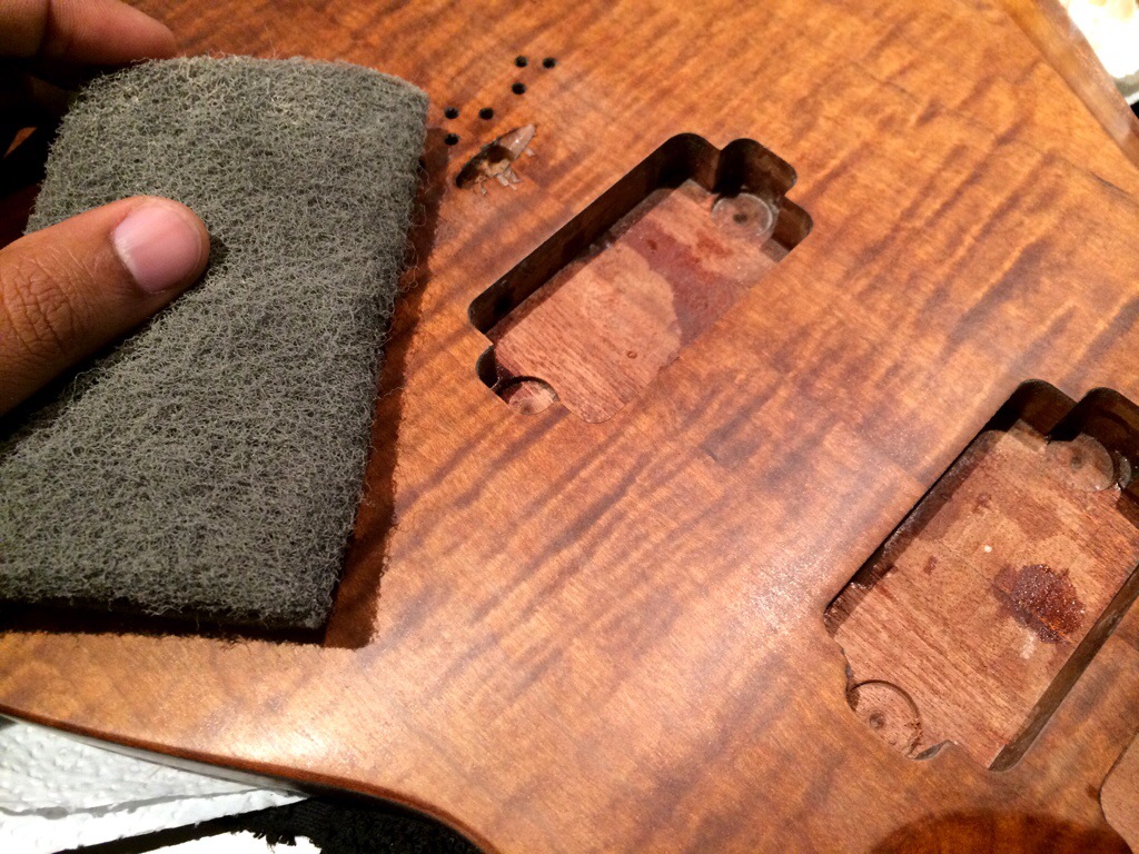 I’ve been knocking down each coat with 000 synthetic wool. Typically I’d use 0000 regular steel wool but that just leaves a horrid mess of things. I keep a can of compressed air nearby which makes life easier.