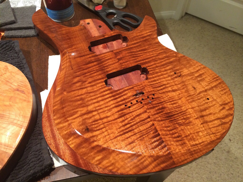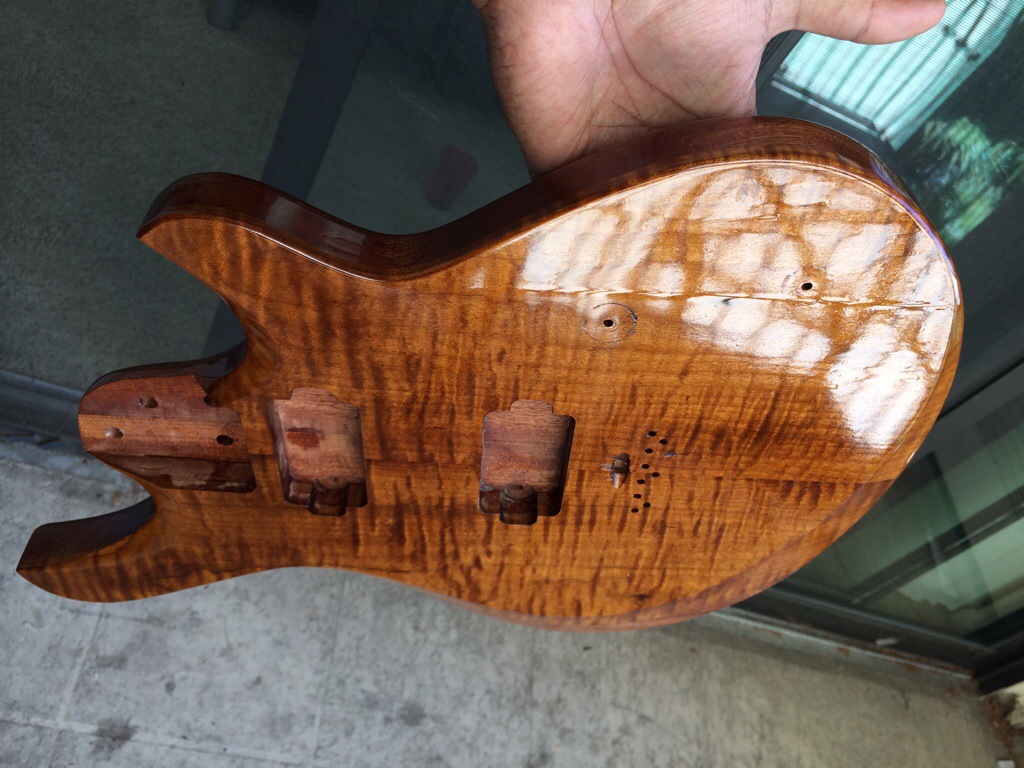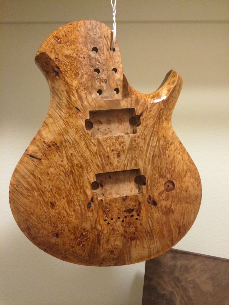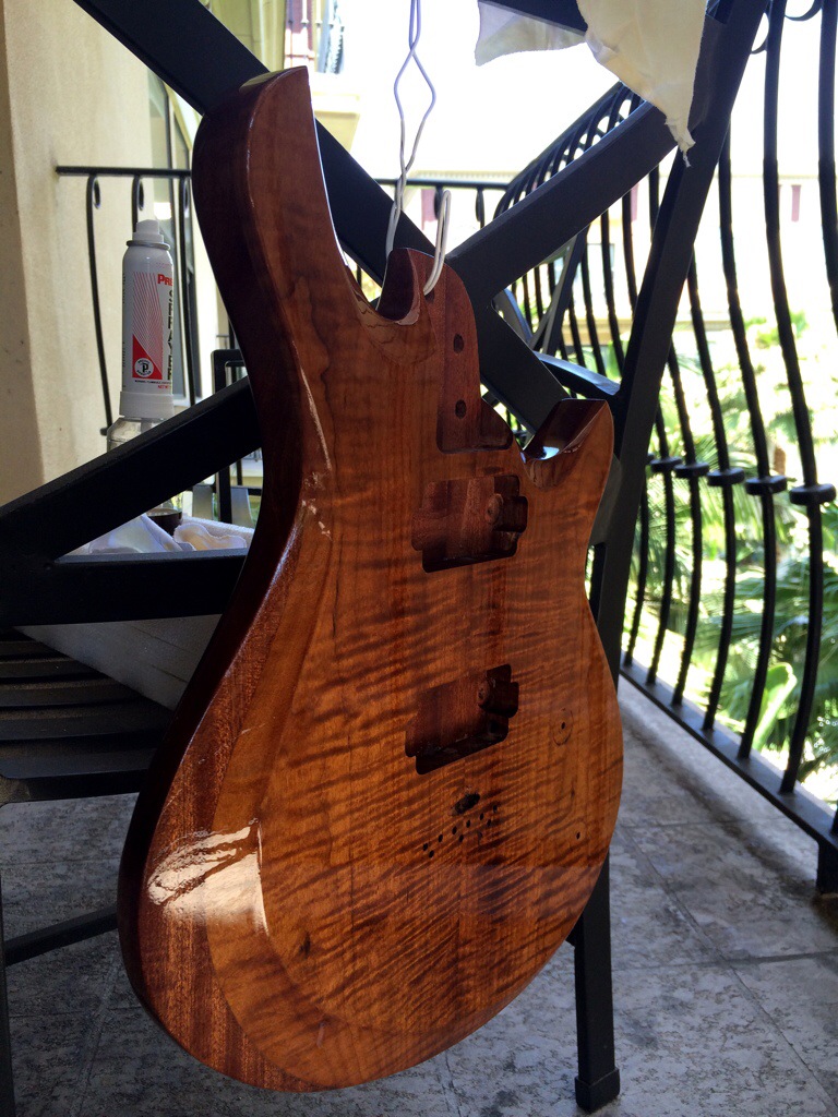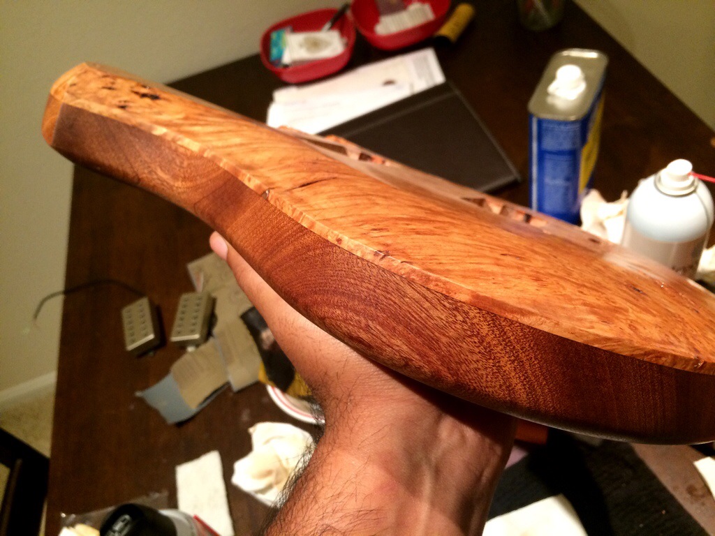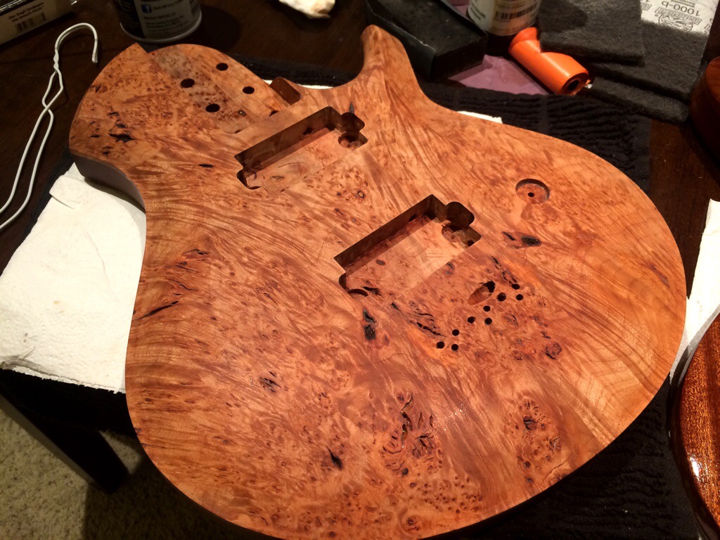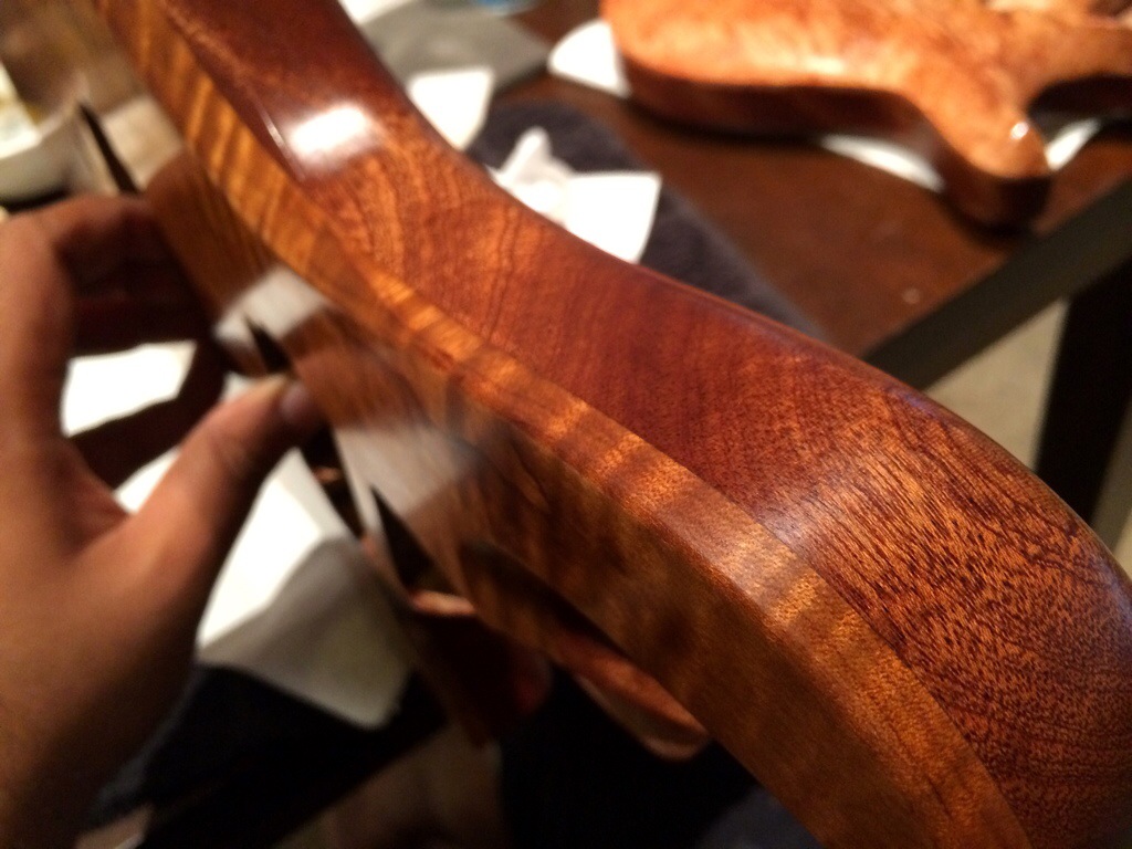 The roasted maple has one coat on all sides and left to dry overnight since the coat is thicker and needs a longer time to dry. The burl maple Top required some serious elbow grease. Once the top was dulled I use the same mix solution from the preval spray, and simply wiped it on. Since it was a thinner mixture it went on smooth and there were no streaks or wipe marks. I left that to dry and set up for neck carving. That I’ll do tomorrow unless I get lazy again.