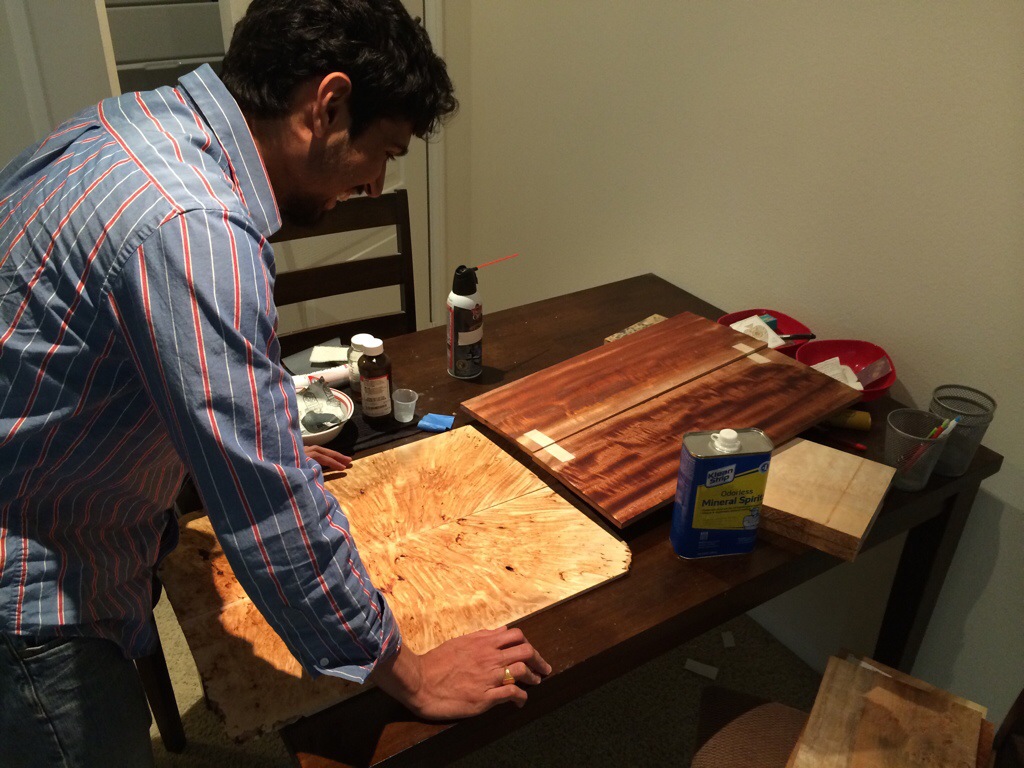 Ganesh is here in LA working on a project which is quite amazing, I’ll provide links to that in the next post. Over lunch we discussed specs and wood combinations. Afterwards I let him take his pick of the new tops I’ve just received. The hardest part was choosing between the burl maple which has an incredible radiating burst pattern and the black mottled makore which just has an insane shimmering figure. In the end the burl won out because of its uniqueness.