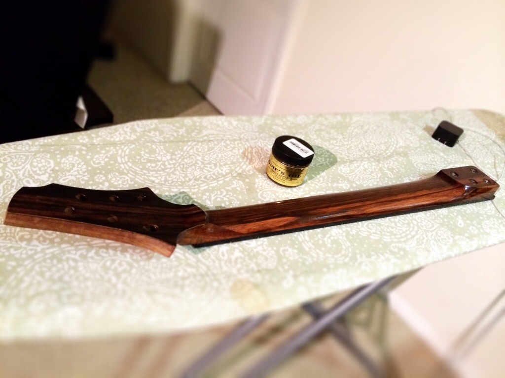 For this guitars neck I’ve been using Odie’s oil. It smells amazing and is marketed to be this crazy non toxic, food safe finish. Thing is no one knows what’s inside and for a small bottle like this, it’s quite expensive; but I’m a sucker for good packaging so I bought it anyways. So far so good. I’ve done some tests before and it gets the sheen I enjoy without the build of tru oil. Honestly I might venture to give this a shot on the roasted maple body. In fact I think that’s exactly what I’ll do.