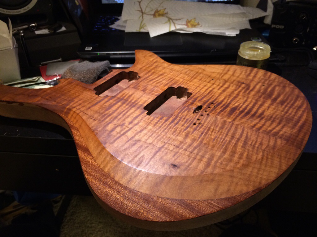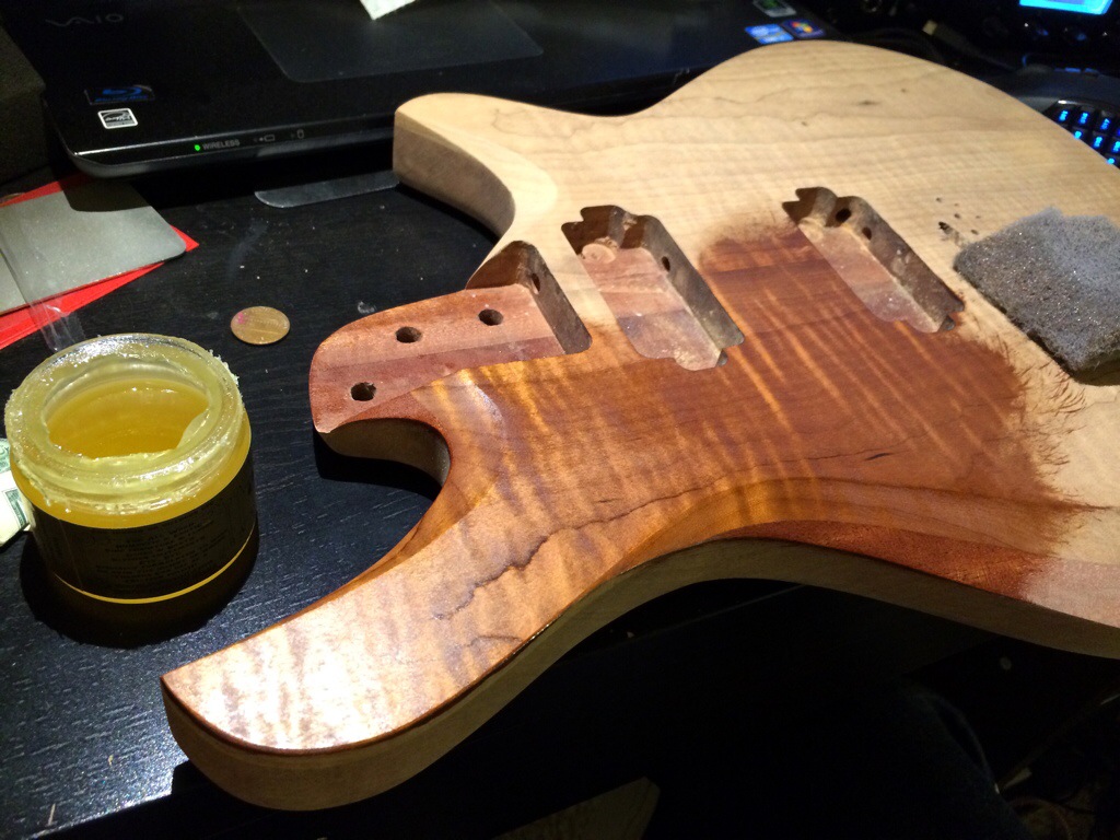 I like the smell and consistency of this product. I also like the fact that it doesn’t darken the piece as much as other oils. I used some 000 synthetic steel wool to apply the finish to the wood then waited about 20 min then buffed off. Ill sand with 320 then 400 with the oil for the next two coats and then I’ll apply a paste wax. I like to let each coat dry about two days or so. I’m pretty happy that I sanded off the previous finish attempt.