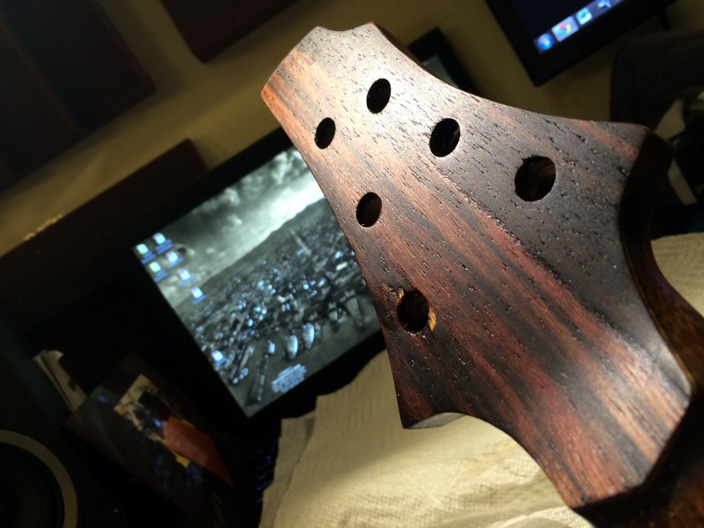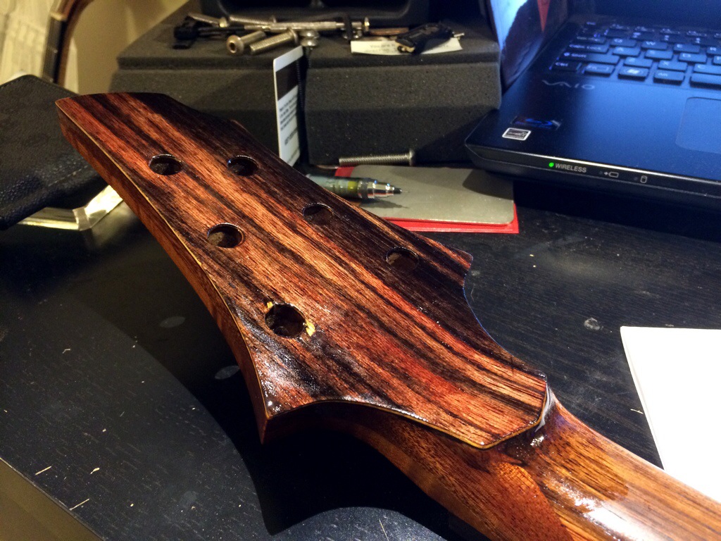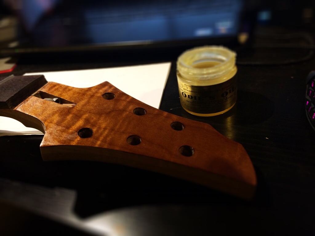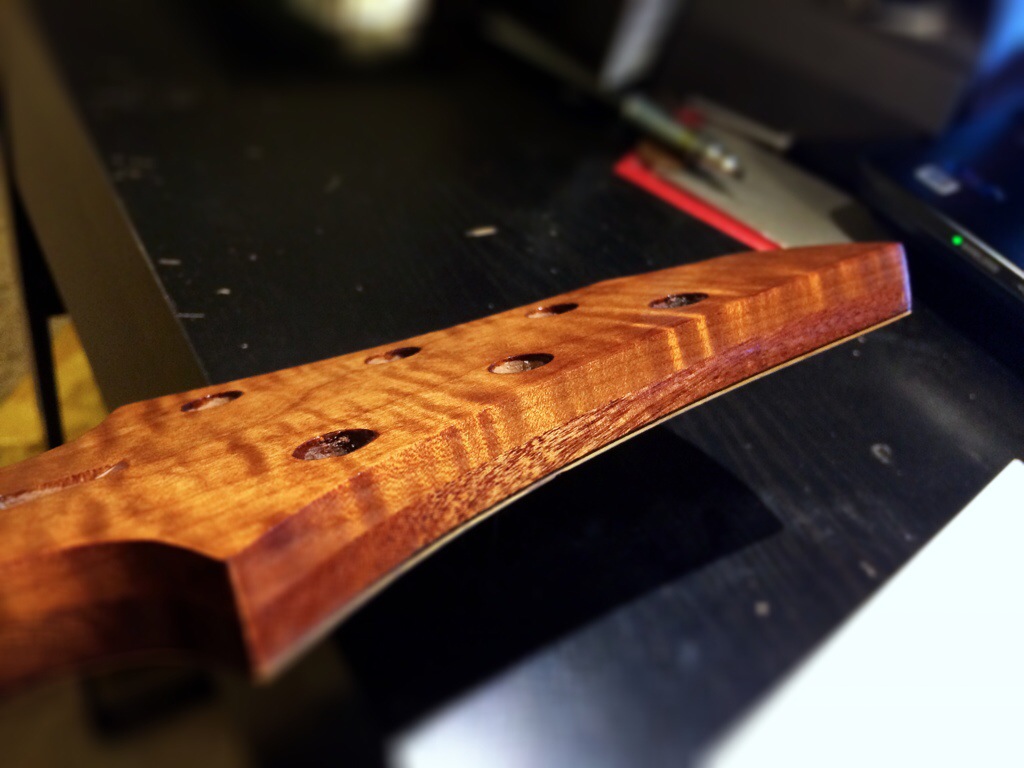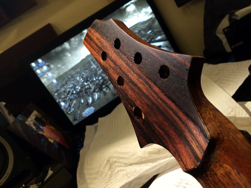 I’m really loving this. I might honestly stop after 600 grit because this luster is so warm and inviting. I’m really eager to use the wood butter and wax that the guys over at Odie’s oil are sending me. Anyways that should arrive tomorrow. I’ll do the final coats this thurs and Friday night then leave to dry over the weekend. The neck’s peghead has been sanded up to 320. I’ll probably just do a few coats on the face after I route the access for the inlay tomorrow.