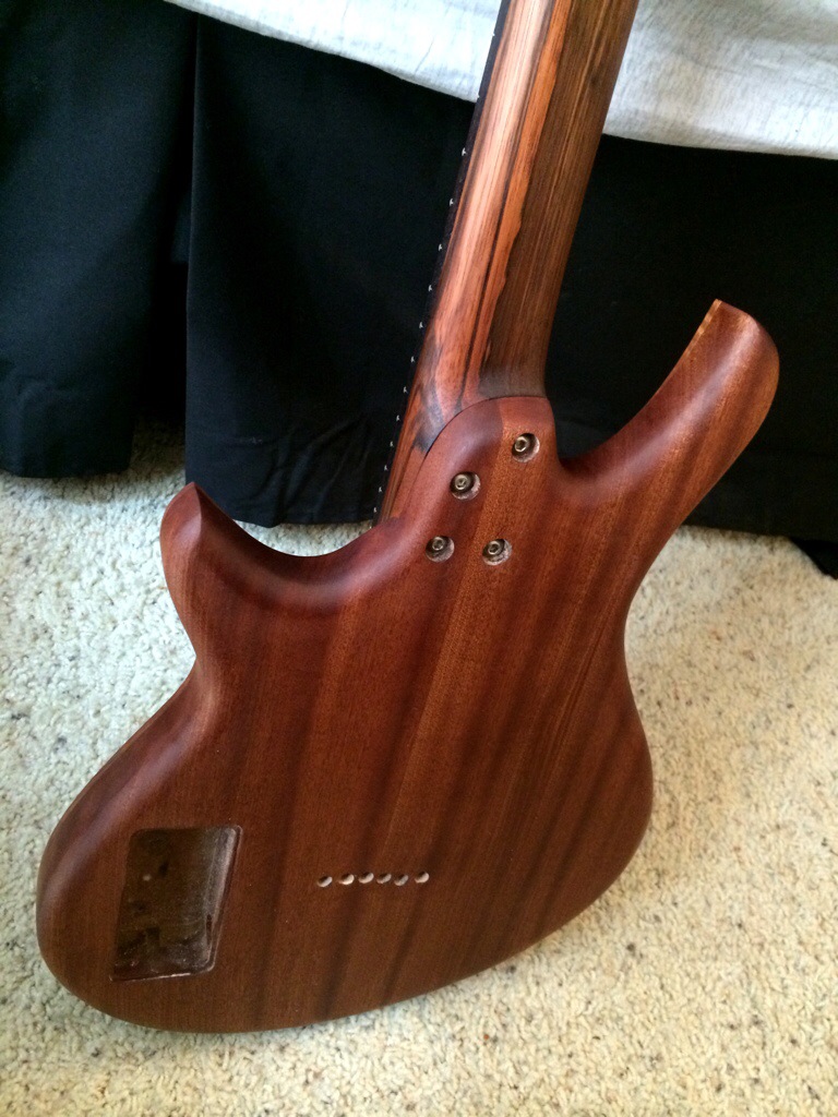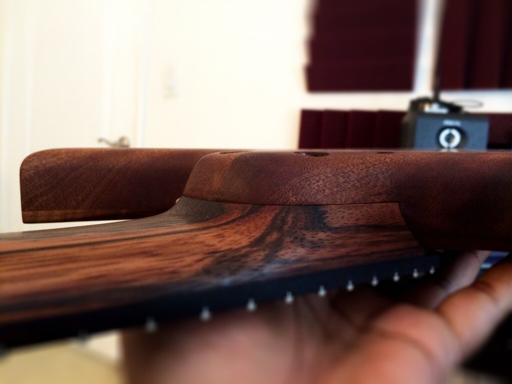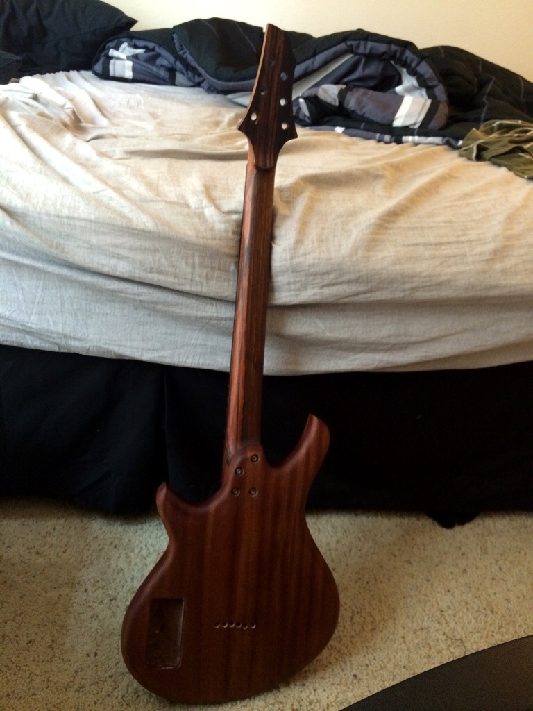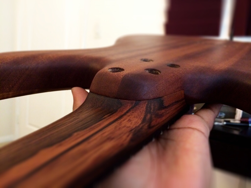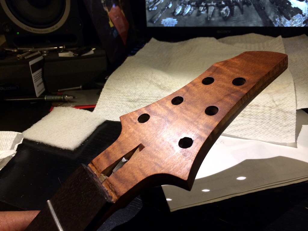 I’m really loving this. I might honestly stop after 600 grit because this luster is so warm and inviting. I’m really eager to use the wood butter and wax that the guys over at Odie’s oil are sending me. Anyways that should arrive tomorrow. I’ll do the final coats this thurs and Friday night then leave to dry over the weekend. The neck’s peghead has been sanded up to 320. I’ll probably just do a few coats on the face after I route the access for the inlay tomorrow.