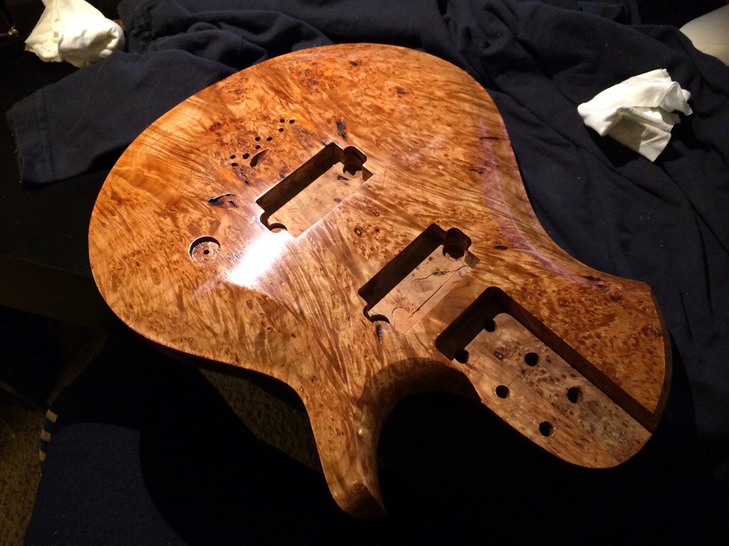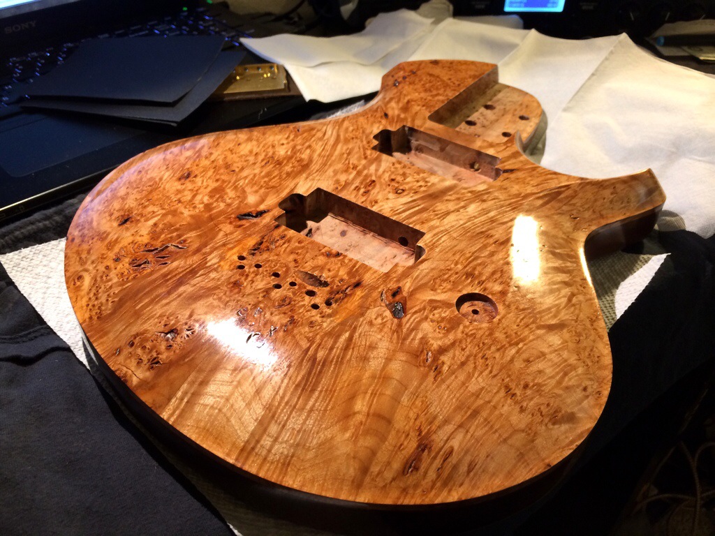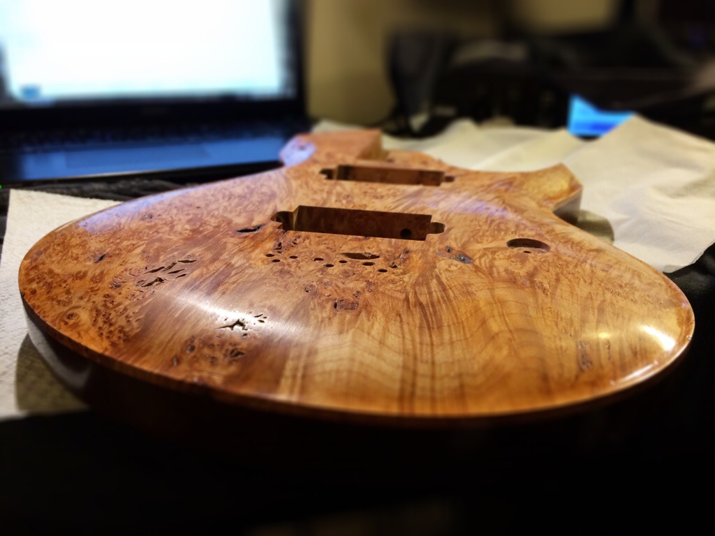 The burl maple has had about 1.5-2 weeks to cure so I scuffed it up with some 0000 synthetic steel wool then I applied some of the wax I received. I’m going to buff that out and then I’ll update this.