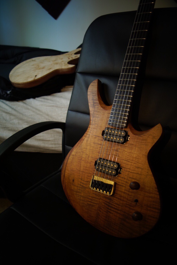 July 11, 2014 Roasted Maple Lives!!! Gonna touch up some areas on the neck profile but other than that this thing is pretty sweet! Joel gave me some great pointers and some advice for the next builds going forward. Thanks Joel! Share this: Click to email a link to a friend (Opens in new window) Email Click to print (Opens in new window) Print Click to share on Facebook (Opens in new window) Facebook Click to share on X (Opens in new window) X Like Loading... Related
