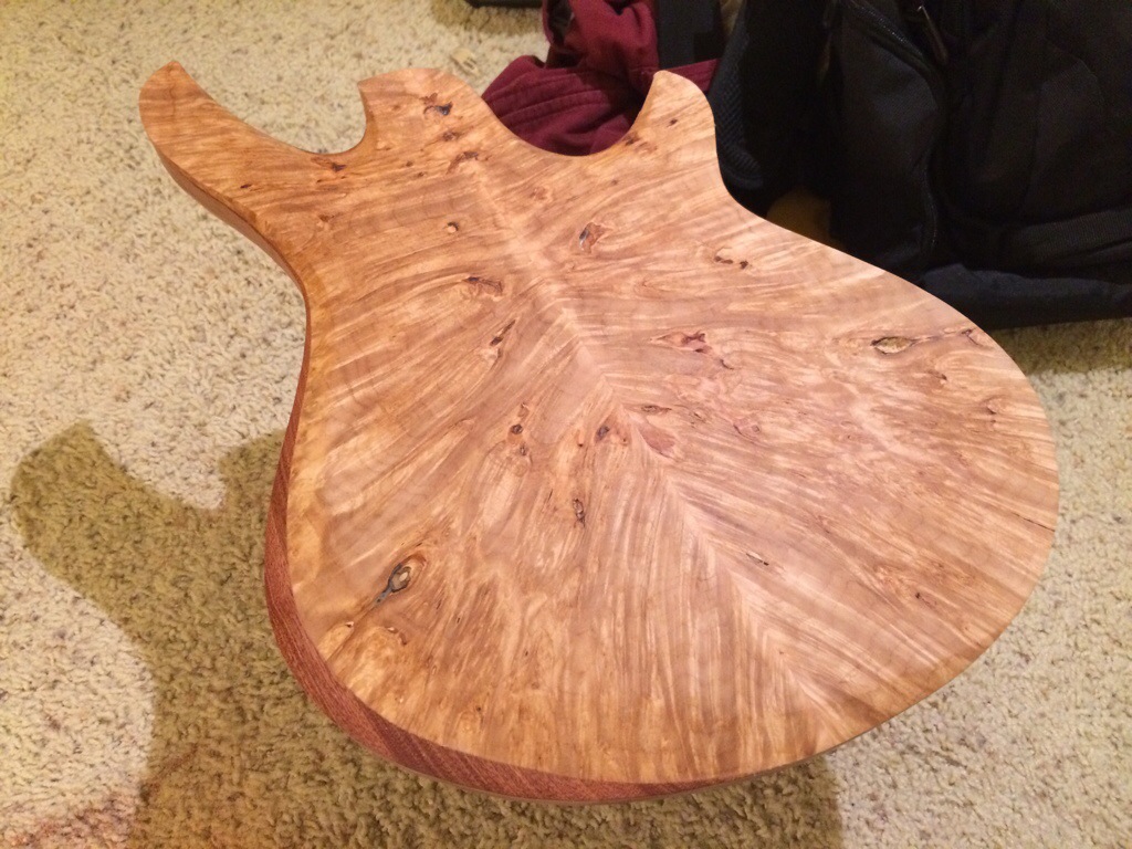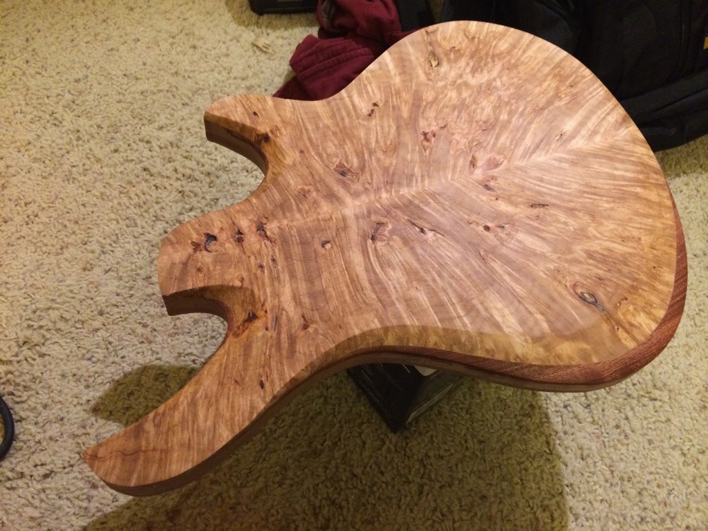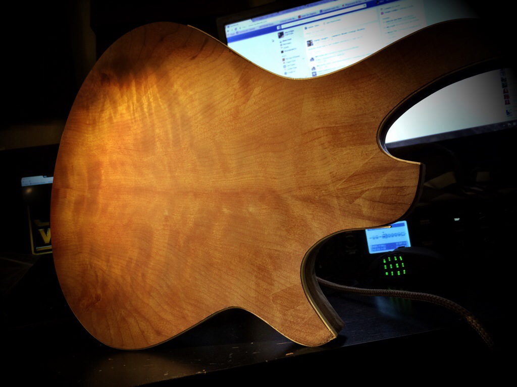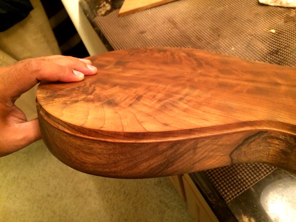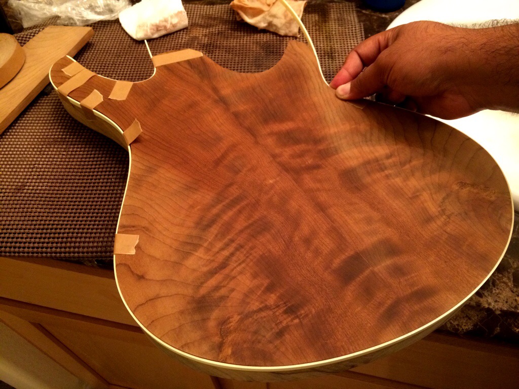 Roger’s walnut body is halfway hollowed. His build requires many more considerations because of its semi hollow nature along with a contoured bevel.