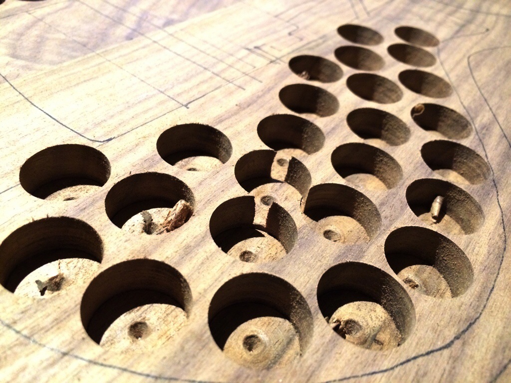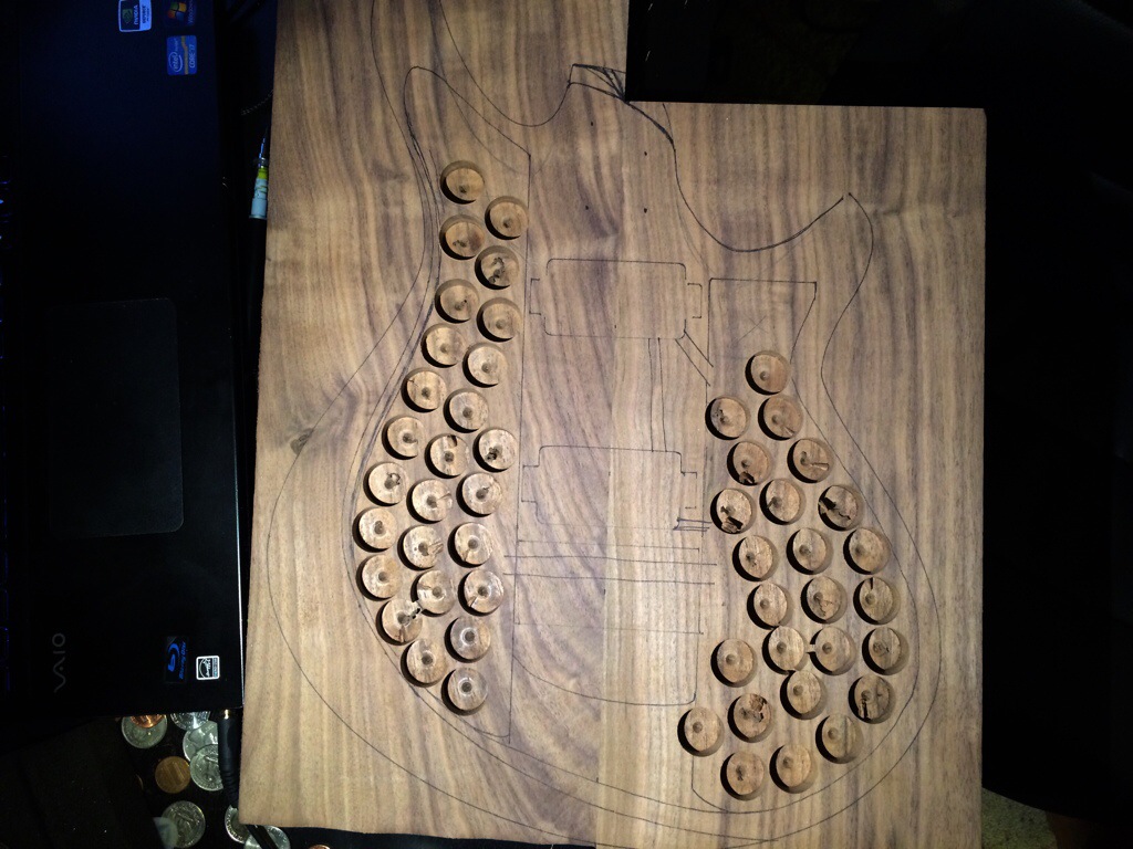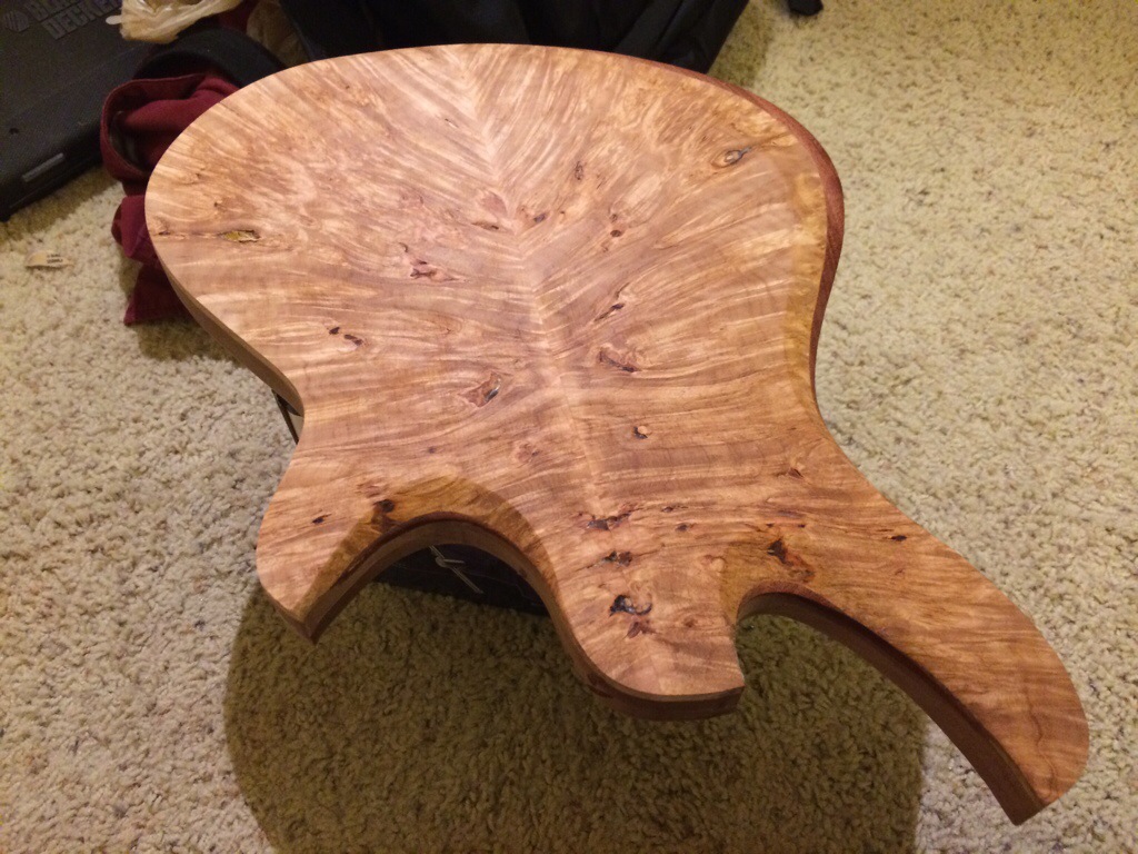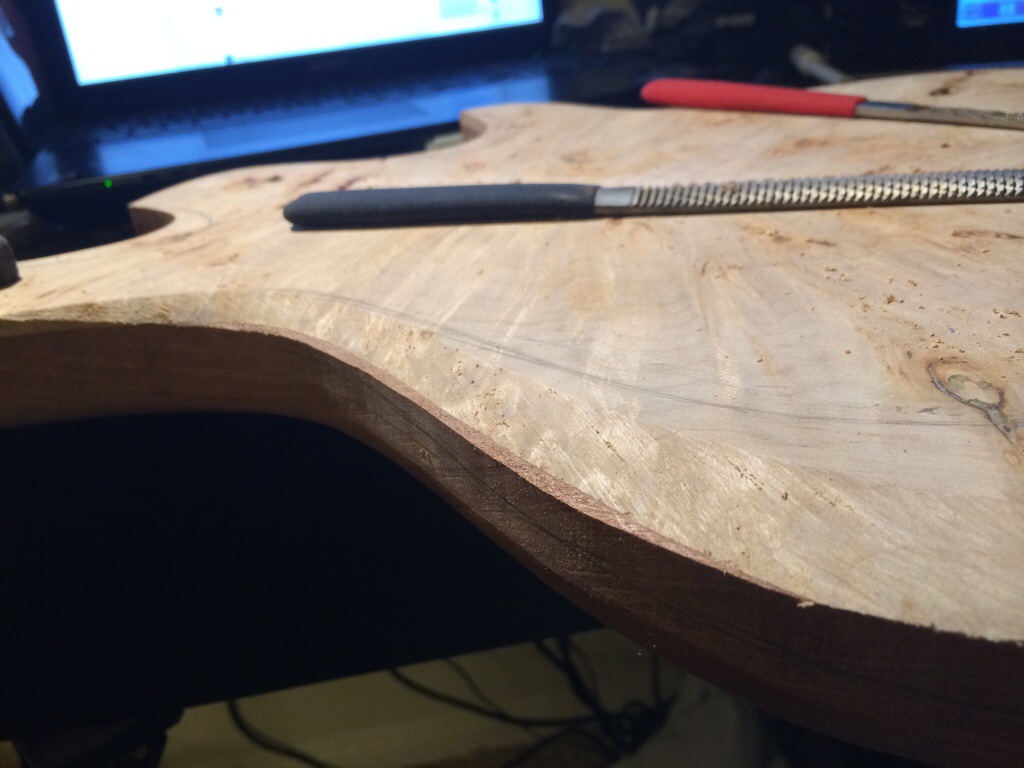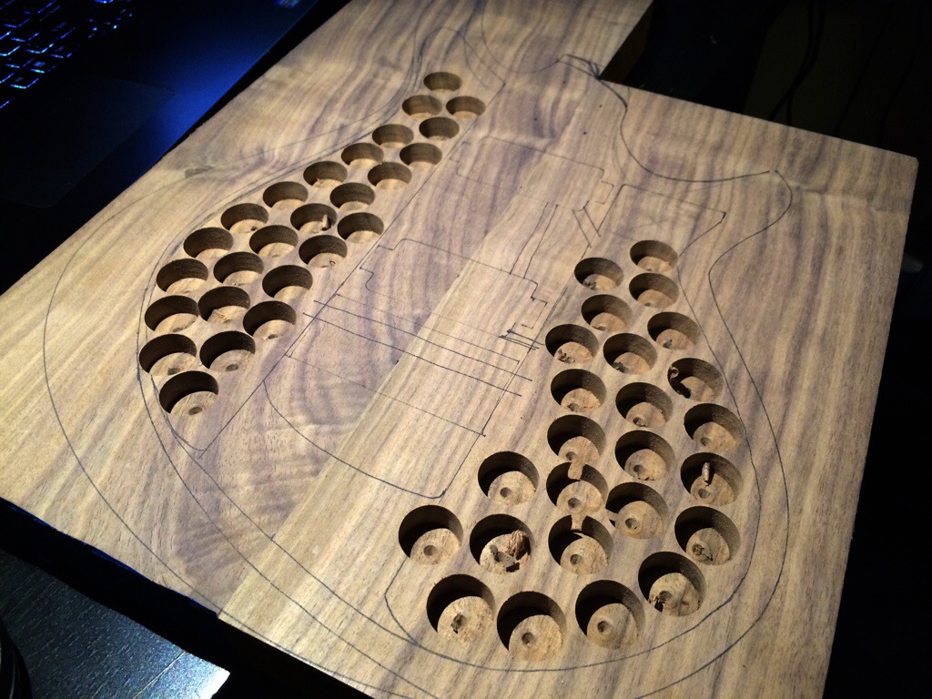 Roger’s walnut body is halfway hollowed. His build requires many more considerations because of its semi hollow nature along with a contoured bevel.